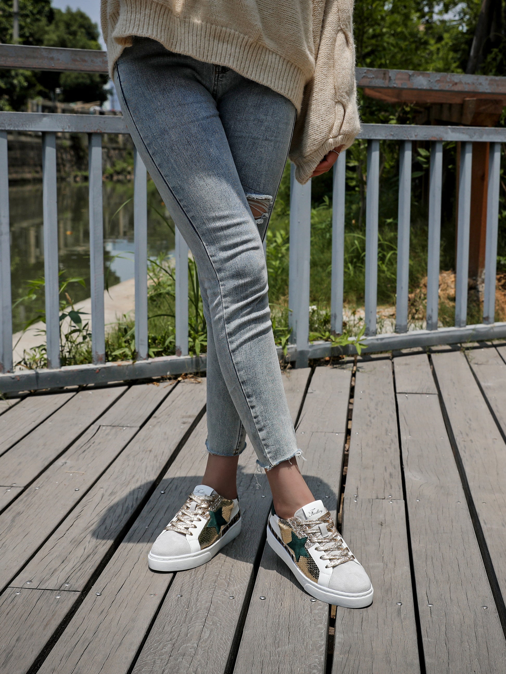 Baskets blanches avec un mélange de différentes matières : dorée, léopard et vert. Elle dispose d'une découpe en forme d'étoile sur les côtés.