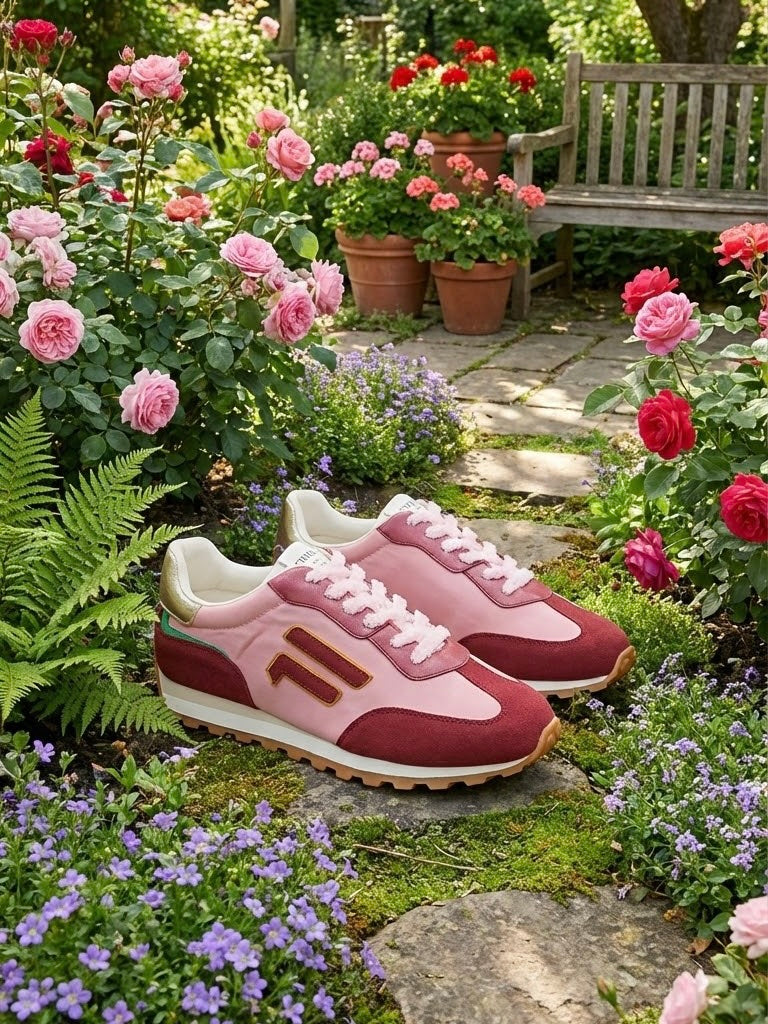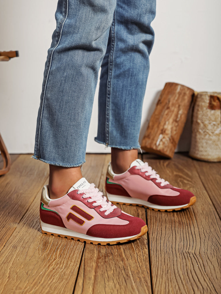 Basket femme au look rétro revisité, mêlant des teintes rose poudré et bordeaux pour un style doux et tendance. Conçue en matières contrastées, elle se distingue par ses détails métallisés et ses finitions soignées. Sa semelle crantée assure confort et adhérence au quotidien. Un modèle original et féminin, idéal pour apporter une touche de caractère à vos tenues casual.