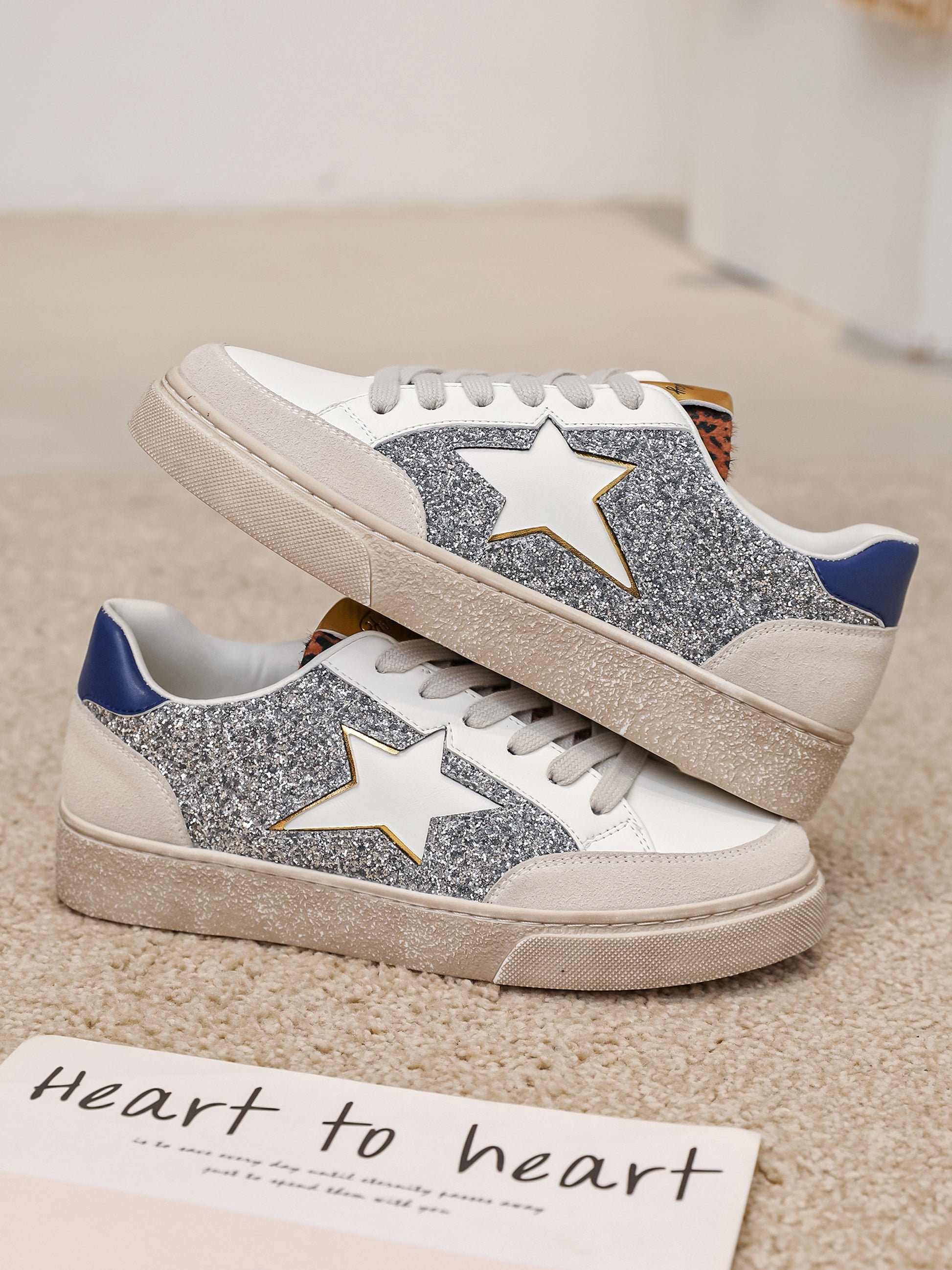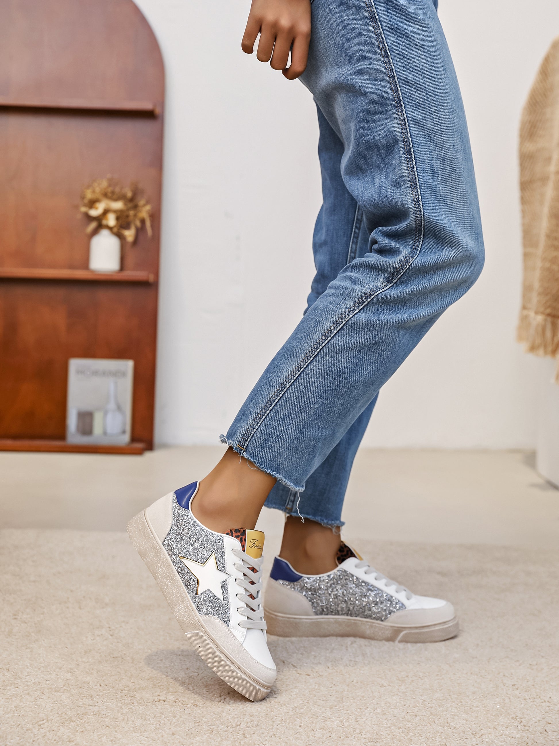 Basket argentée avec un mélange de différentes matières. Elle dispose ainsi d'une découpe en forme d'étoile sur les côtés, d'une languette à motif léopard ainsi qu'un contrefort en simili bleu roi.