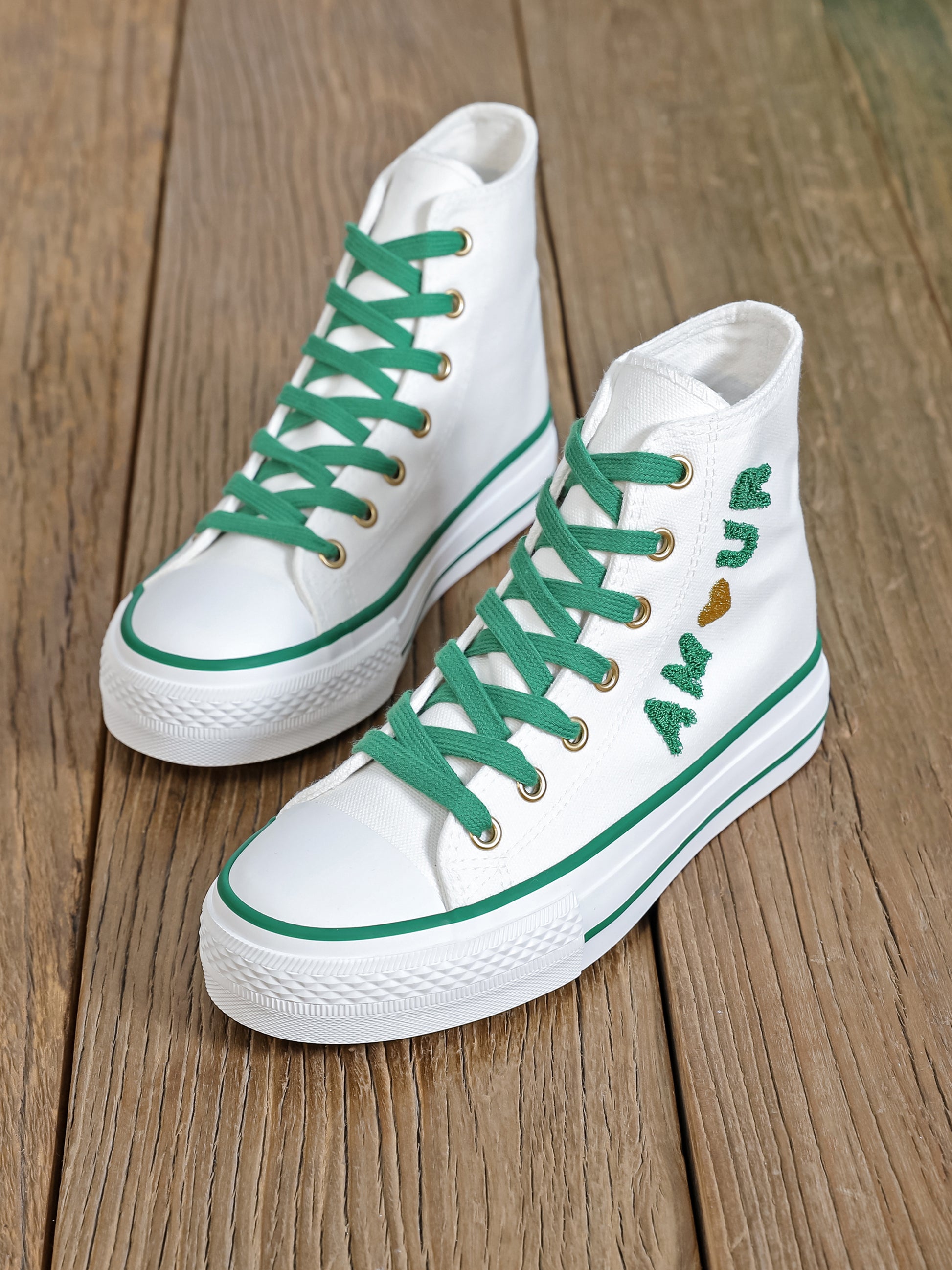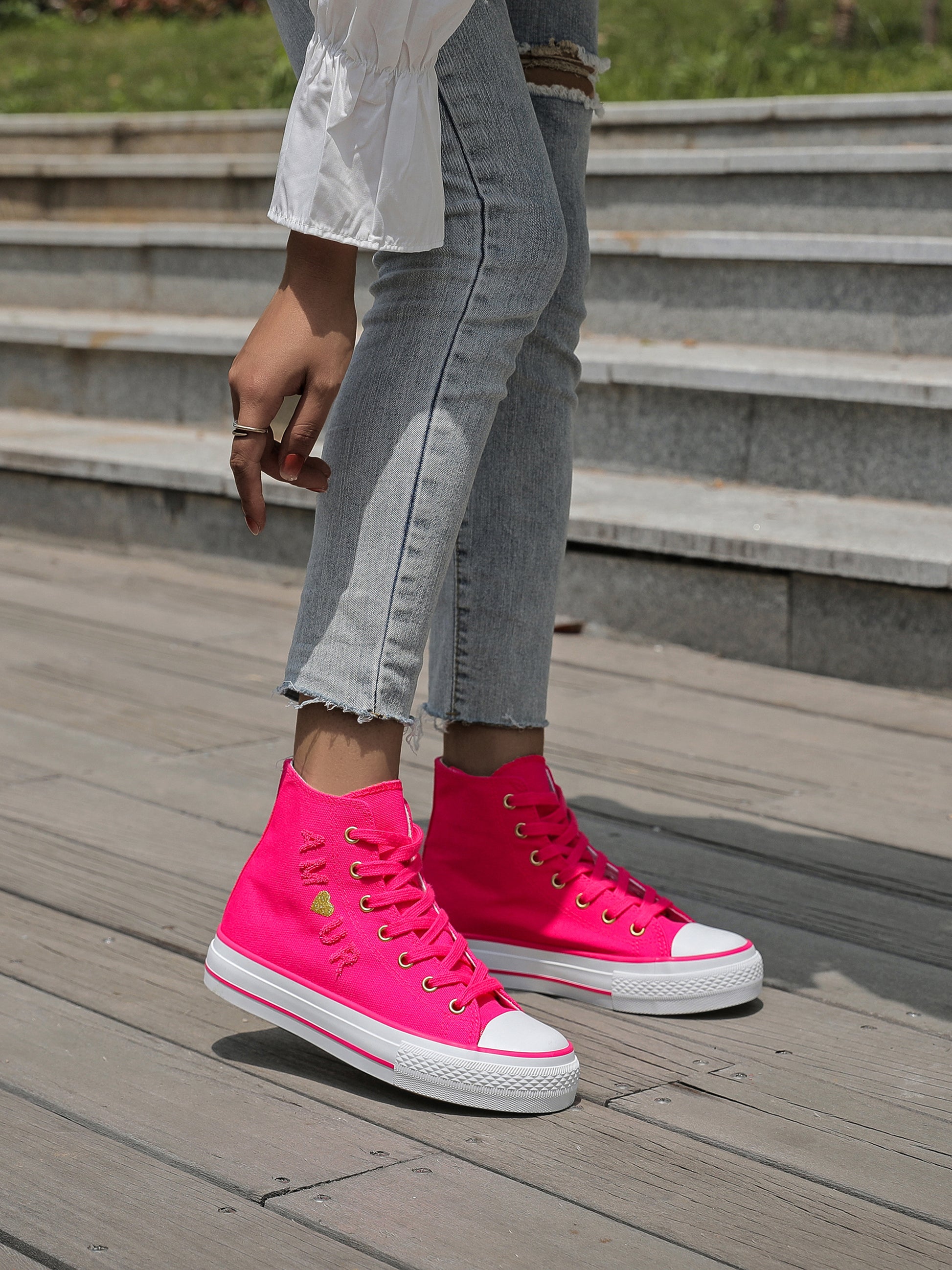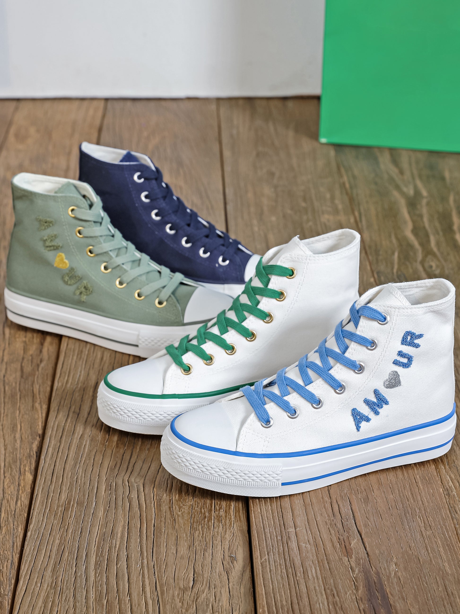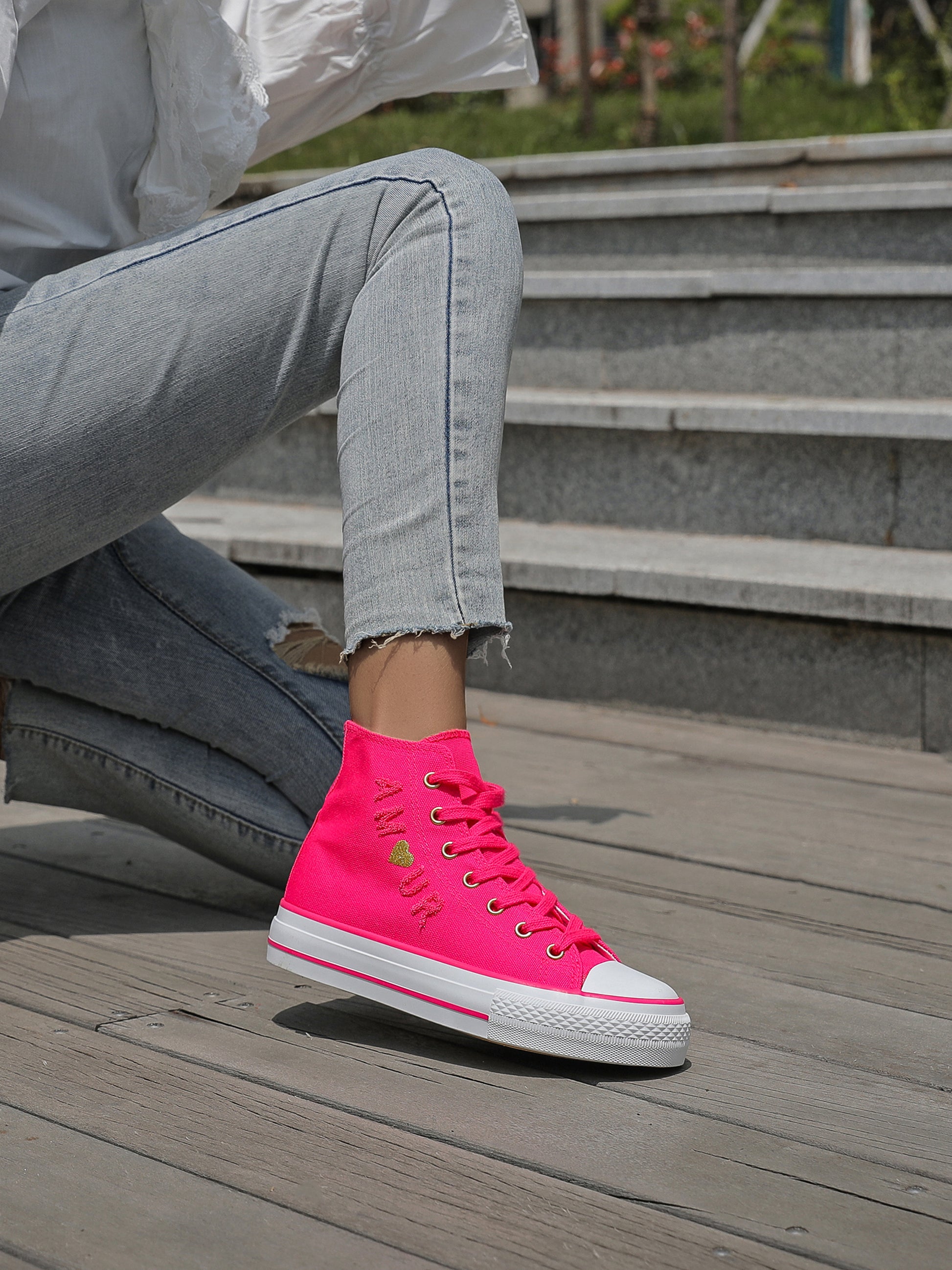 Baskets montantes en toile avec broderie Amour et petit cœur doré / argenté.