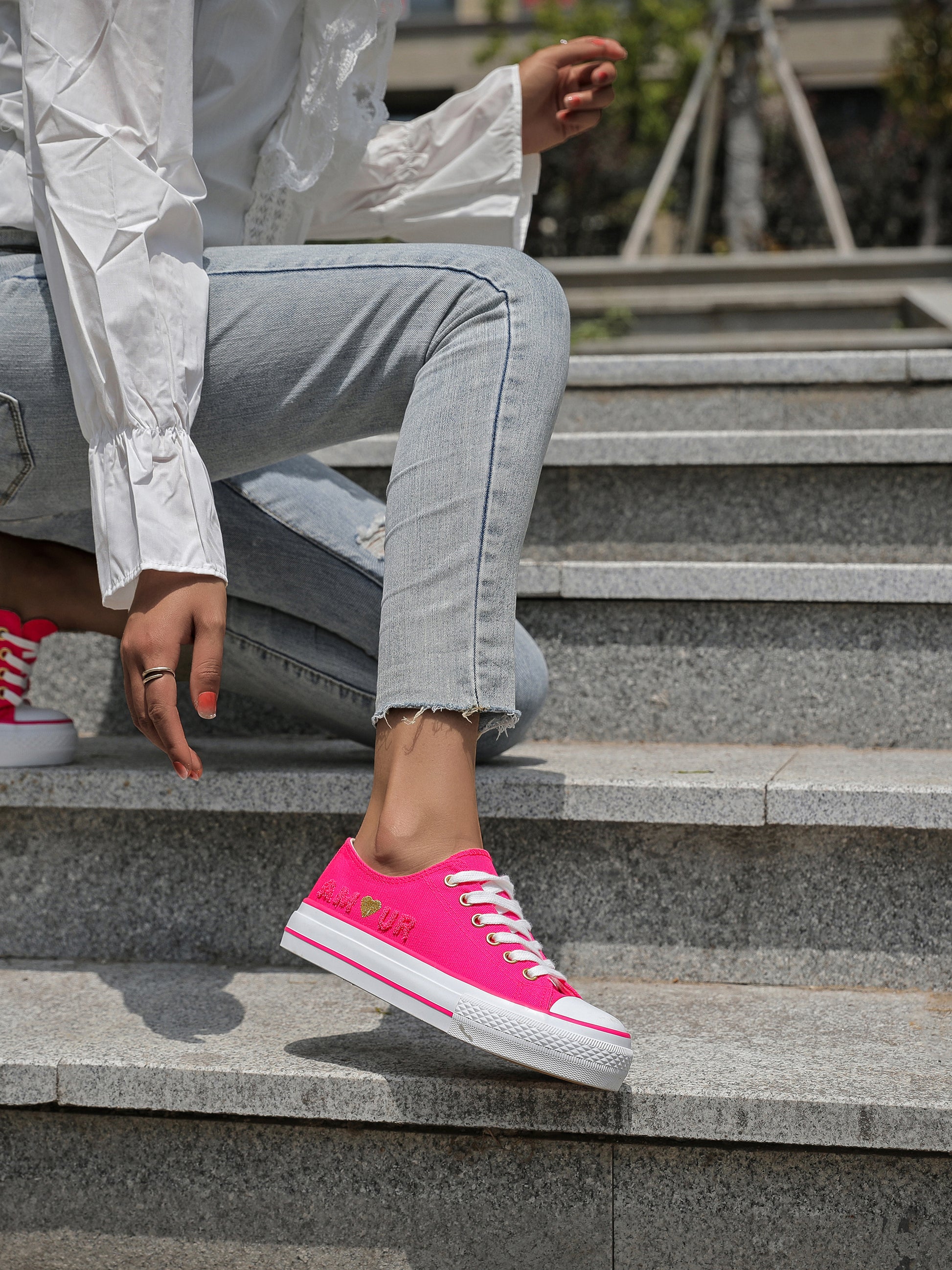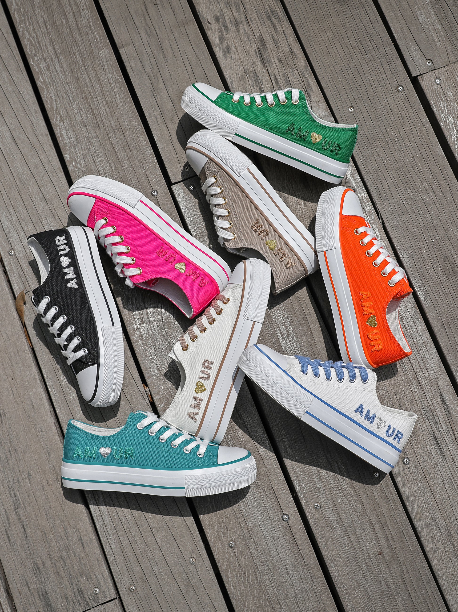 Baskets plates en toile avec broderie Amour et petit cœur doré / argenté.