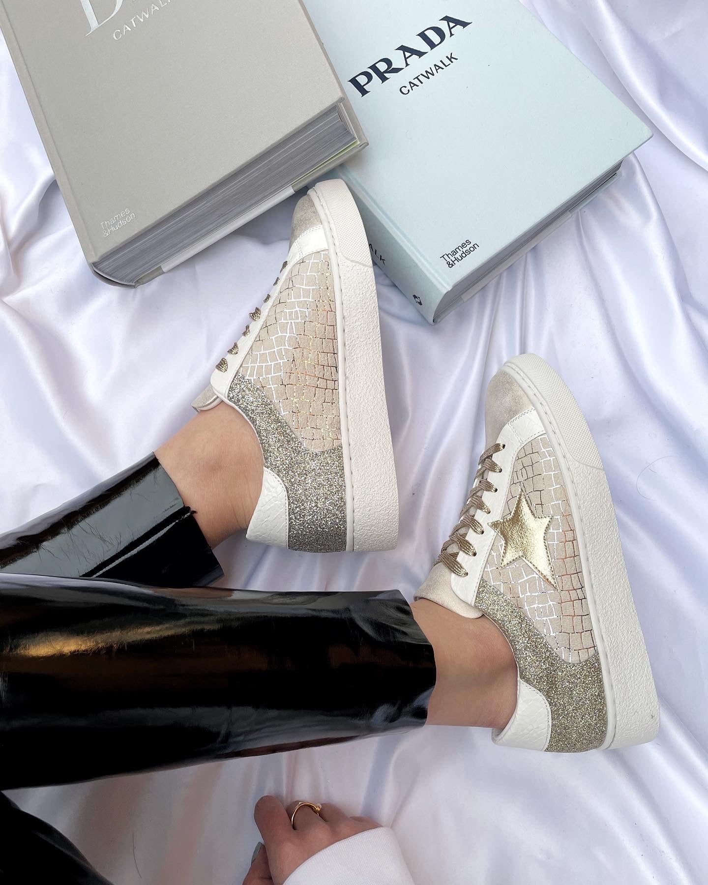 Baskets décorée d'une étoile dorée, lacet or paillette.