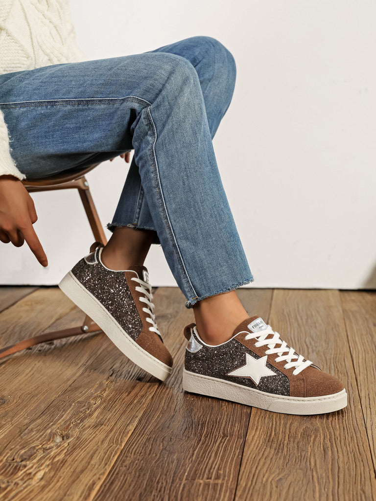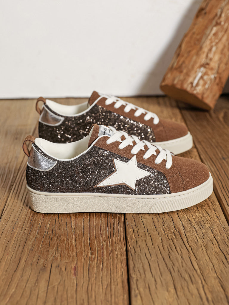Baskets basses au design élégant mariant le suédé marron et des empiècements pailletés noirs.