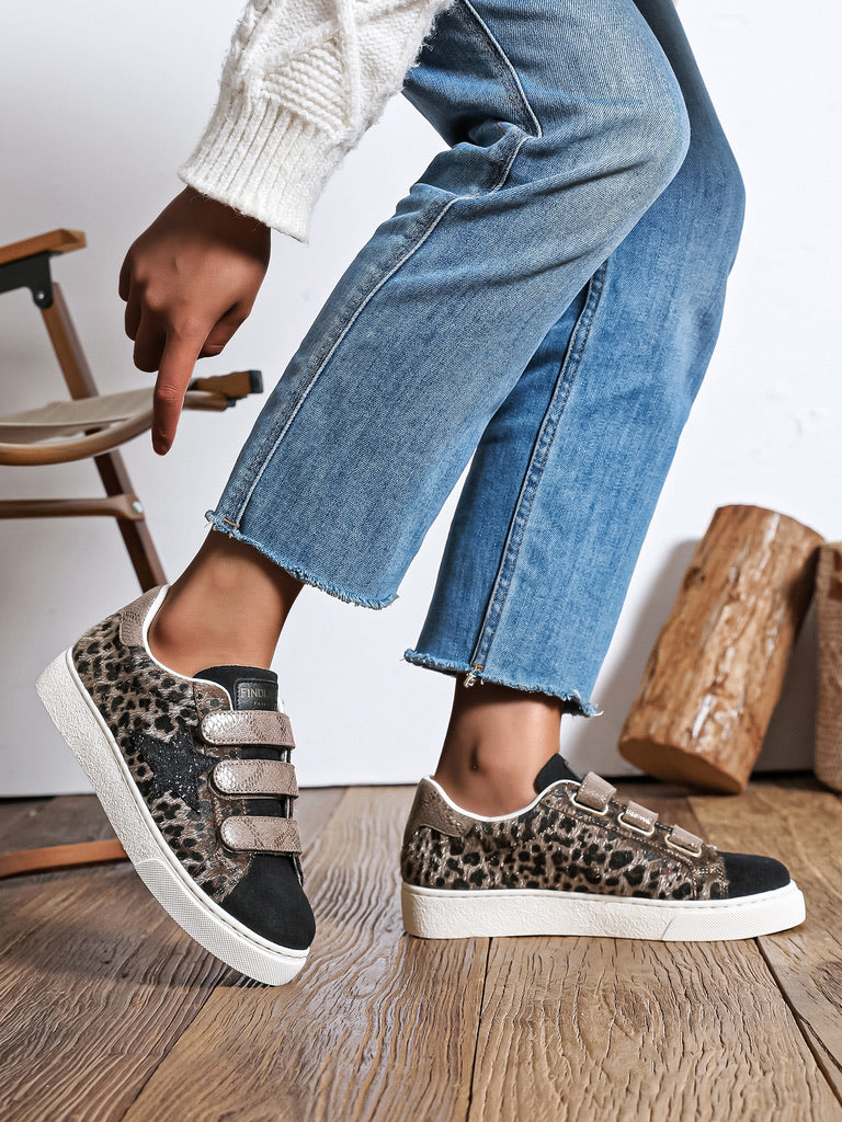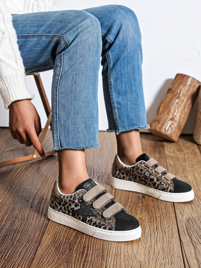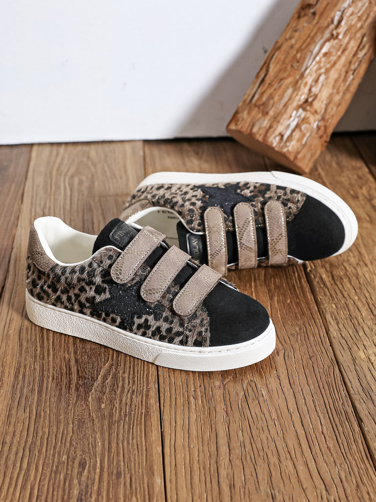 Elles sont en imprimé léopard, avec un bout en suédine noire et une étoile noire pailletée sur le côté.
