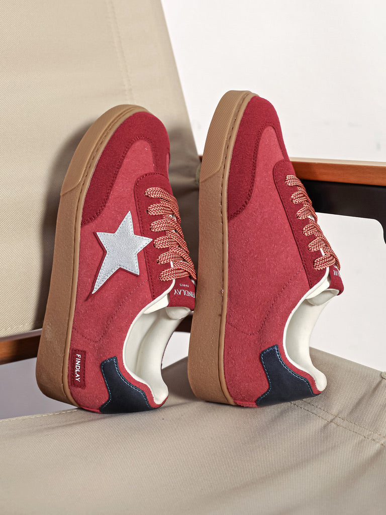 Baskets basses en suédine rouge, ornées d’une étoile argentée contrastante sur le côté. Les lacets bicolores apportent une note graphique, tandis que la semelle en gomme camel souligne une allure rétro-chic. Un empiècement noir à l’arrière vient compléter la silhouette avec élégance. Un modèle vibrant qui conjugue confort et style citadin.