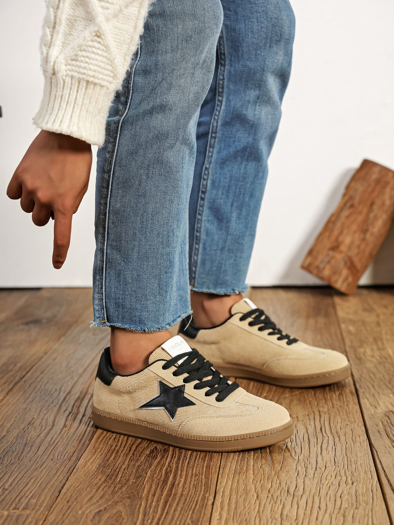 Sneakers beige en effet velours, sublimées par une étoile noire qui attire instantanément le regard. Leur combinaison de lacets et renfort arrière noirs crée un contraste chic, tandis que la semelle camel apporte une touche moderne et chaleureuse. Un modèle stylé, facile à porter et parfait pour dynamiser toutes vos tenues du quotidien.