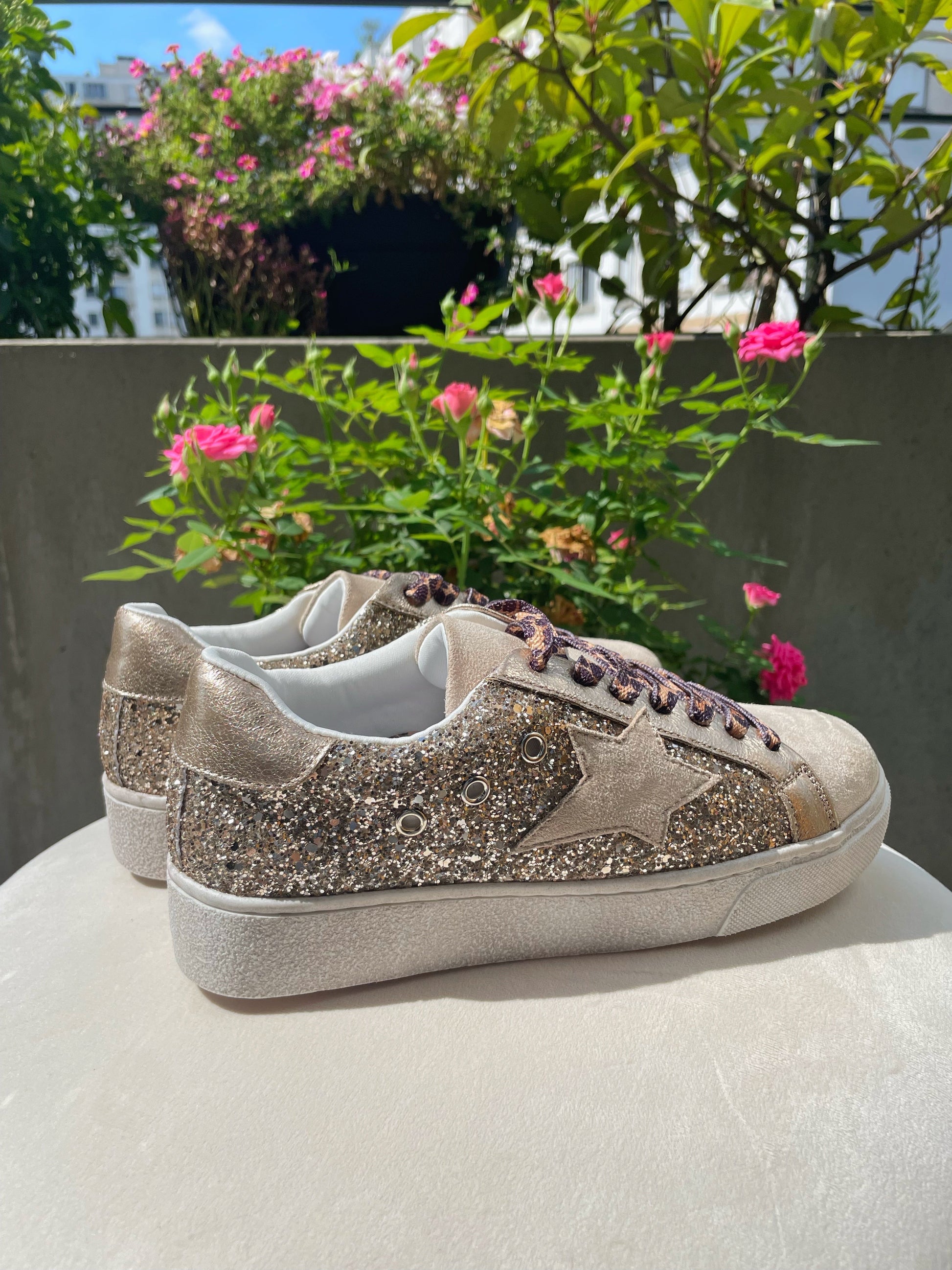 Basket dorée pailletée, bout en suédine beige. Etoile irisée et lacets léopards.