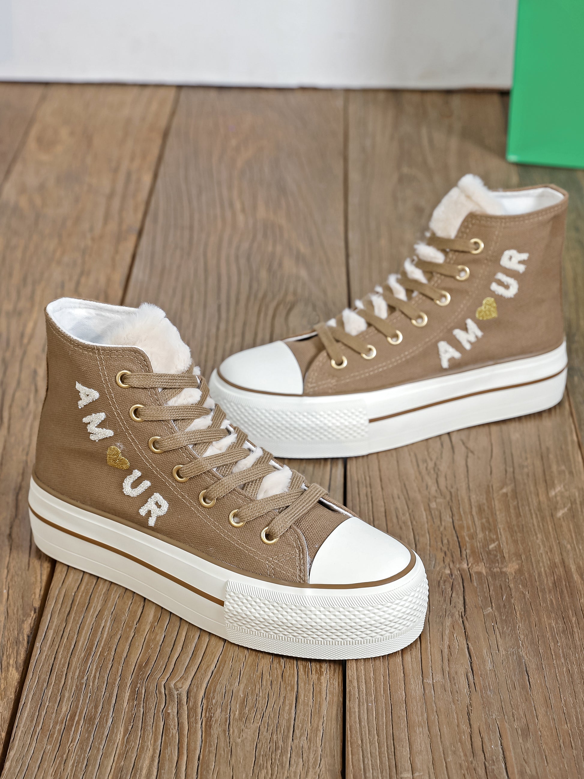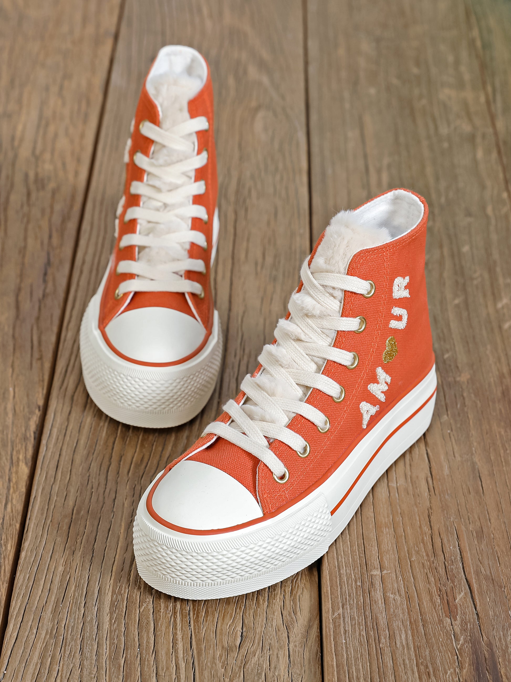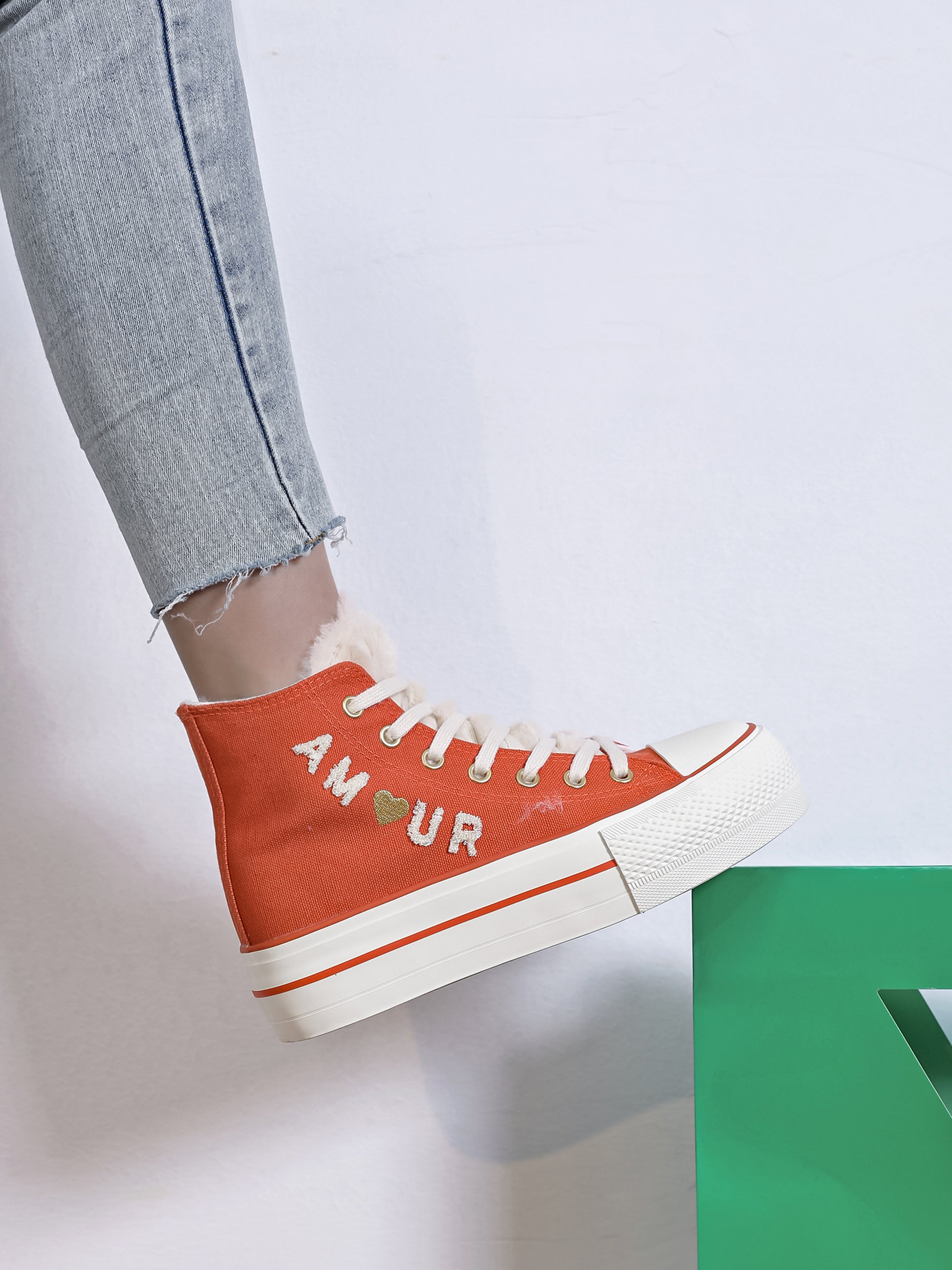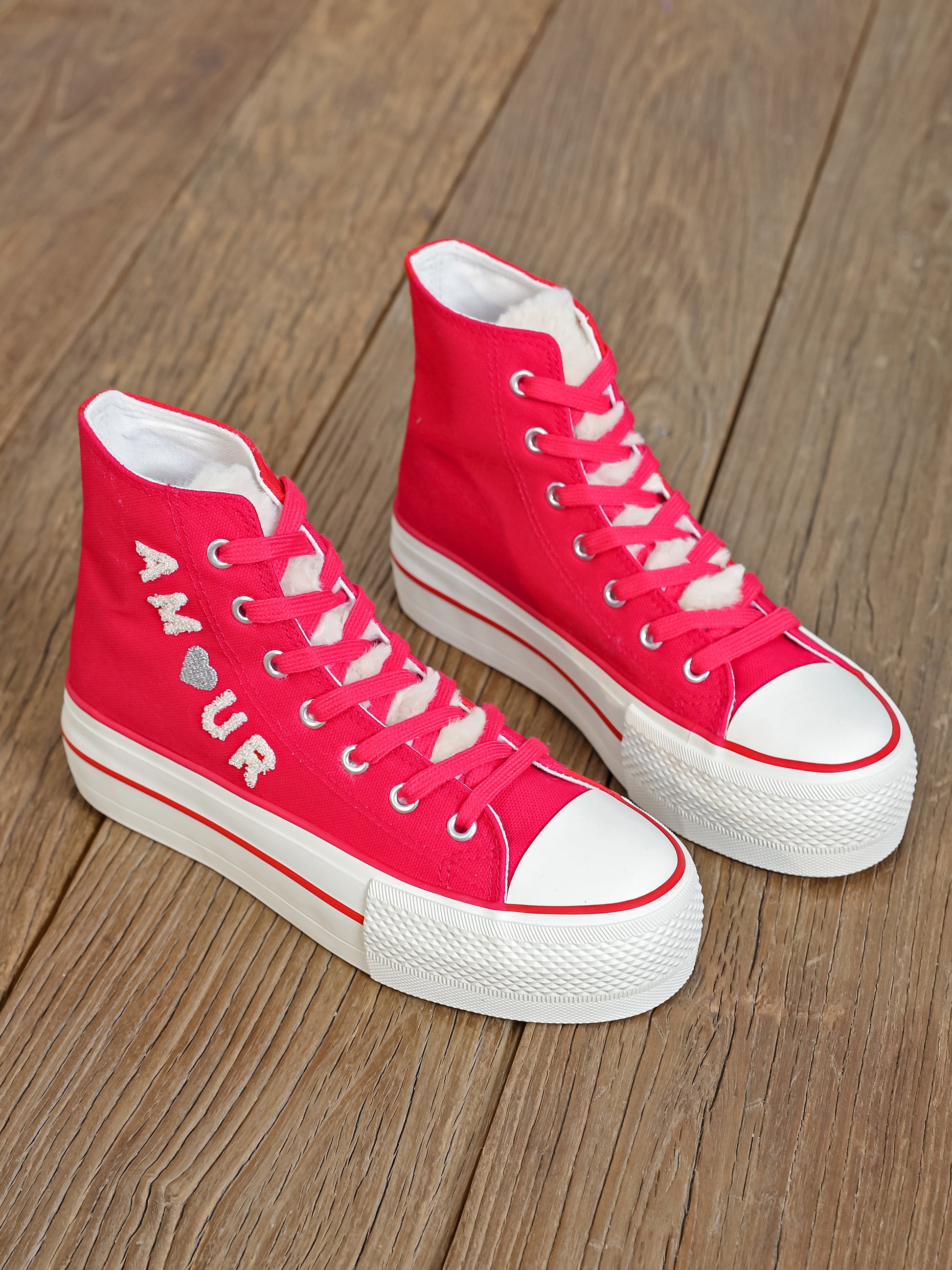 La grande tendance : La basket en toile avec broderie Amour, présentée ici en version fourrée sur la languette de devant.