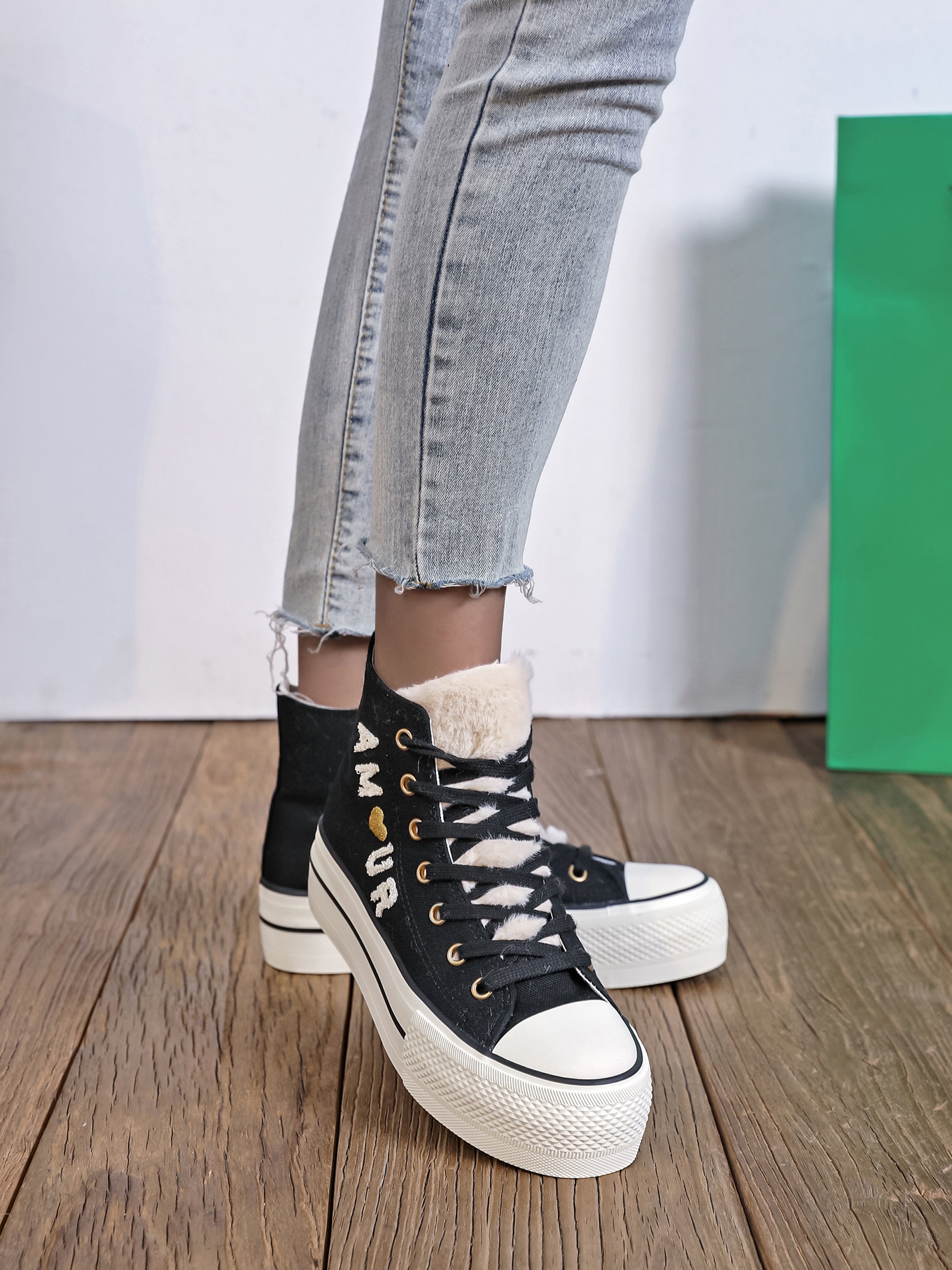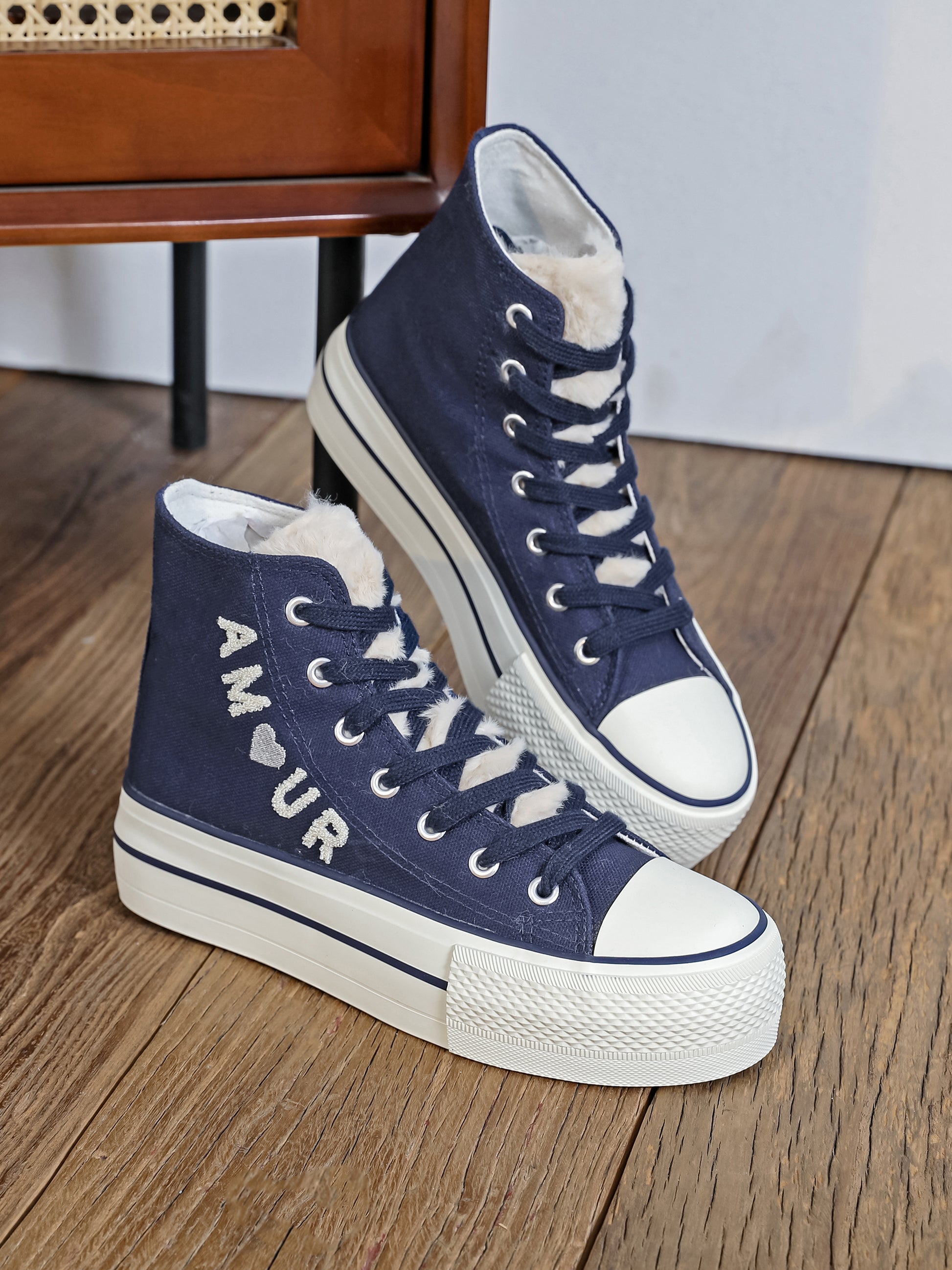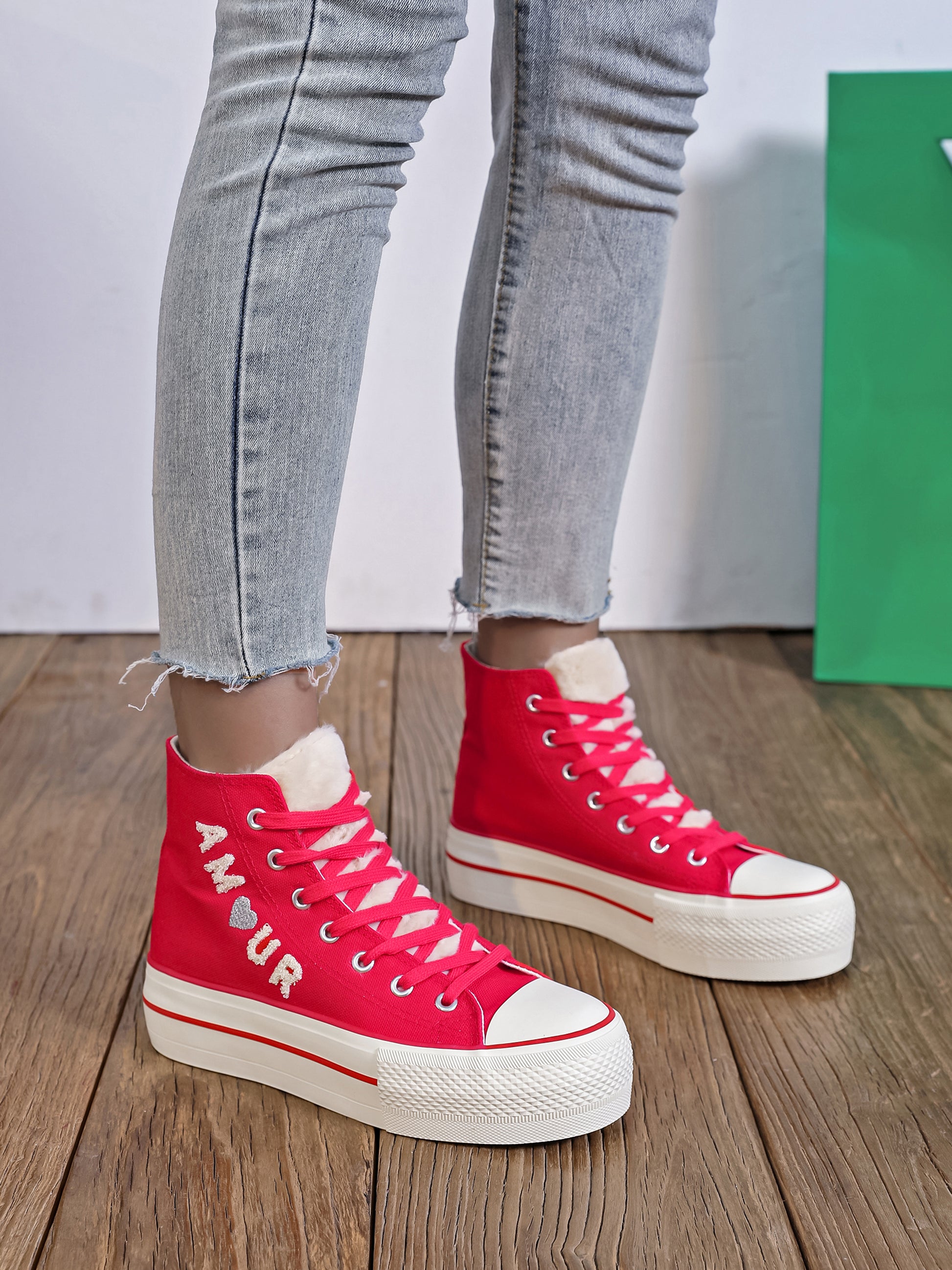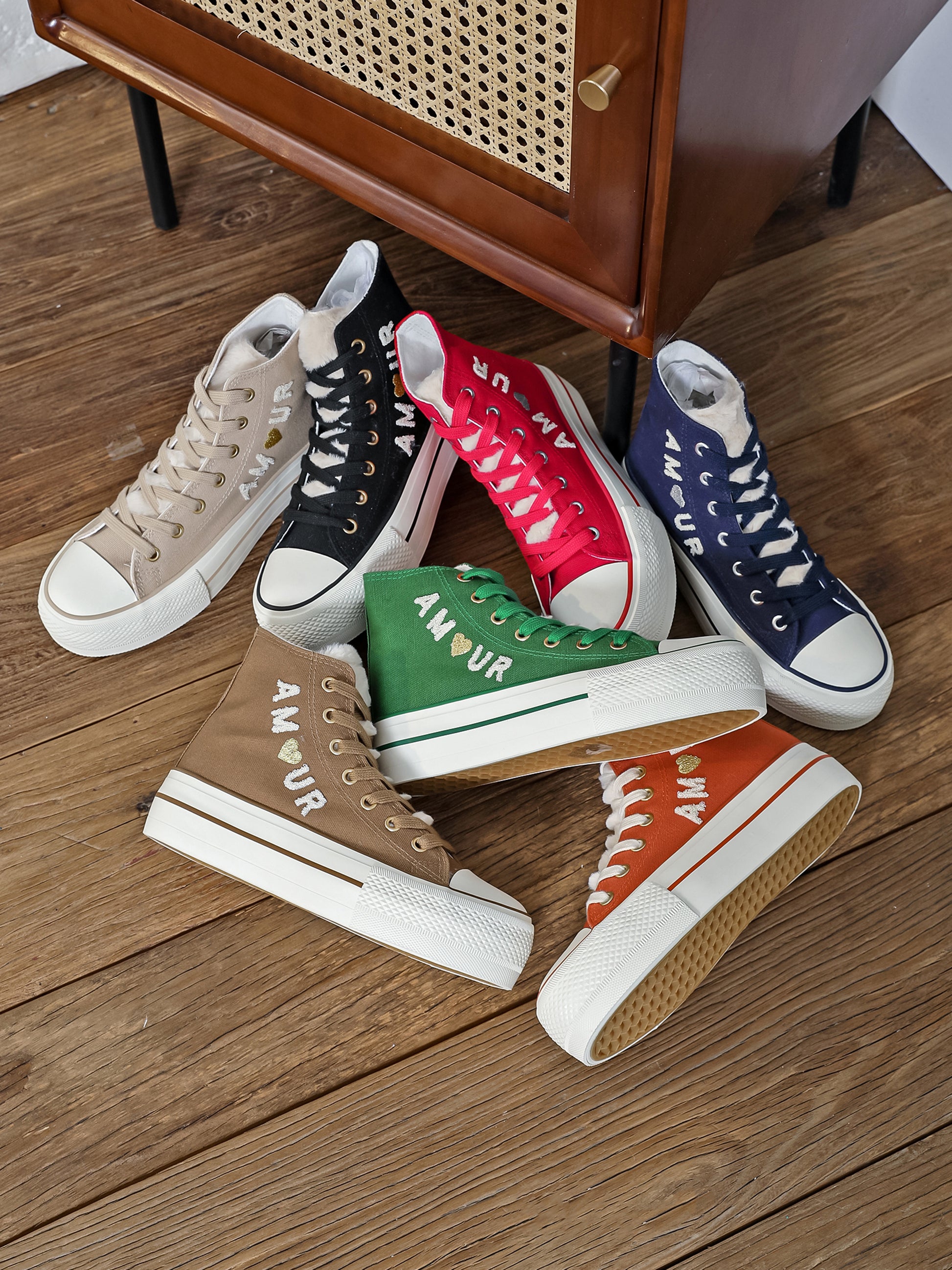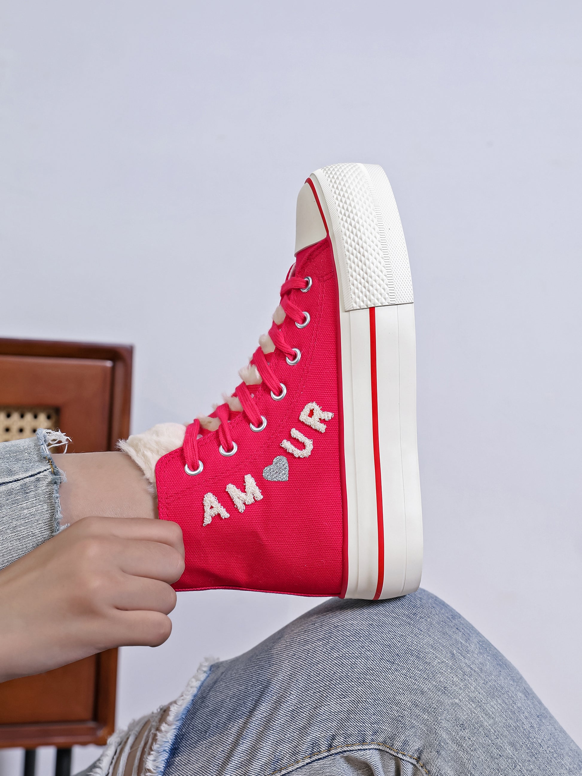La grande tendance : La basket en toile avec broderie Amour, présentée ici en version fourrée sur la languette de devant.