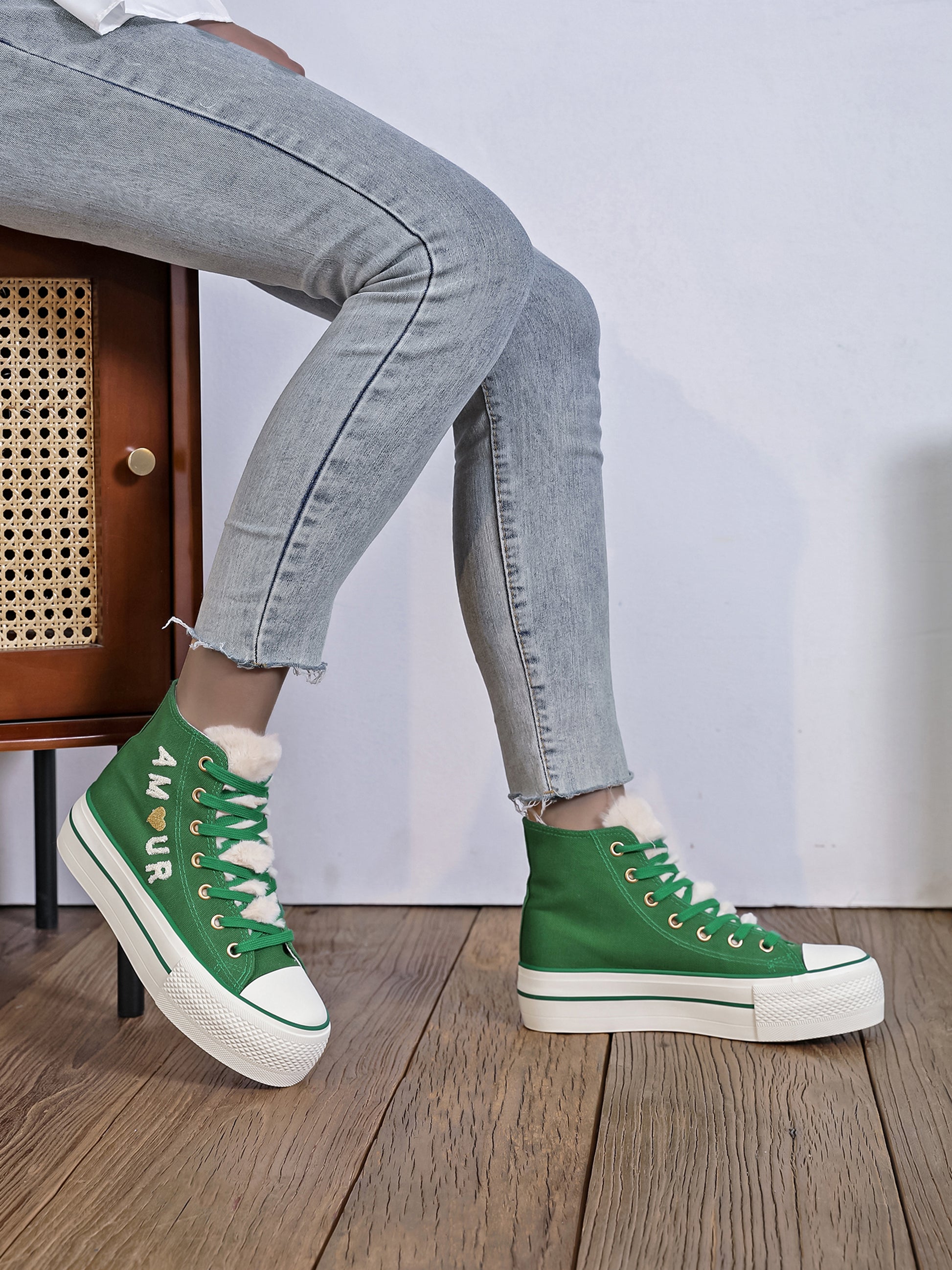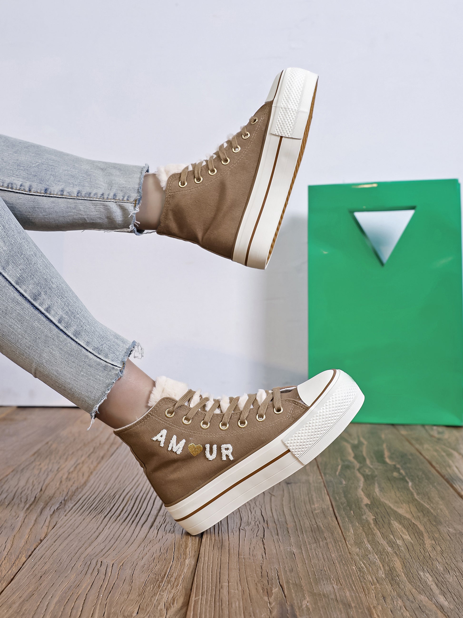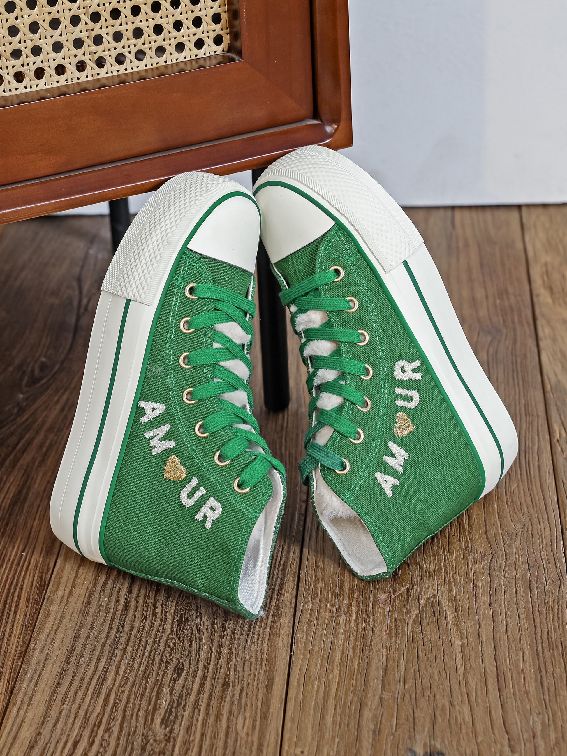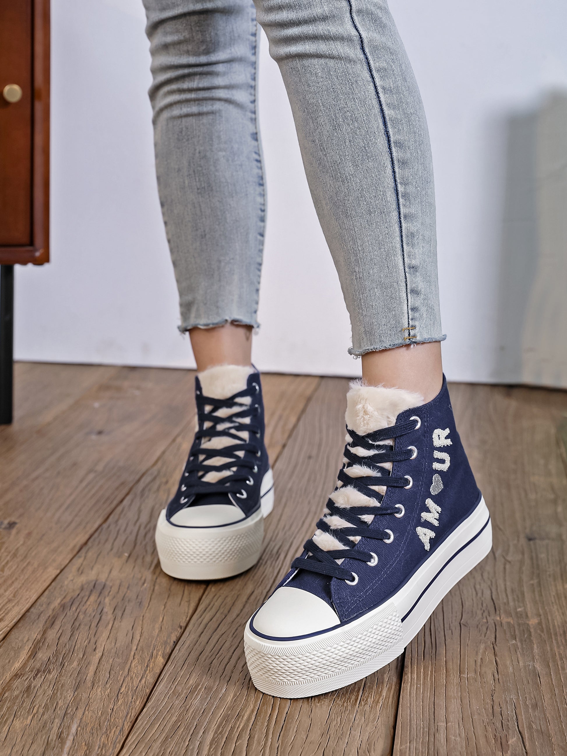 La grande tendance : La basket en toile avec broderie Amour, présentée ici en version fourrée sur la languette de devant.