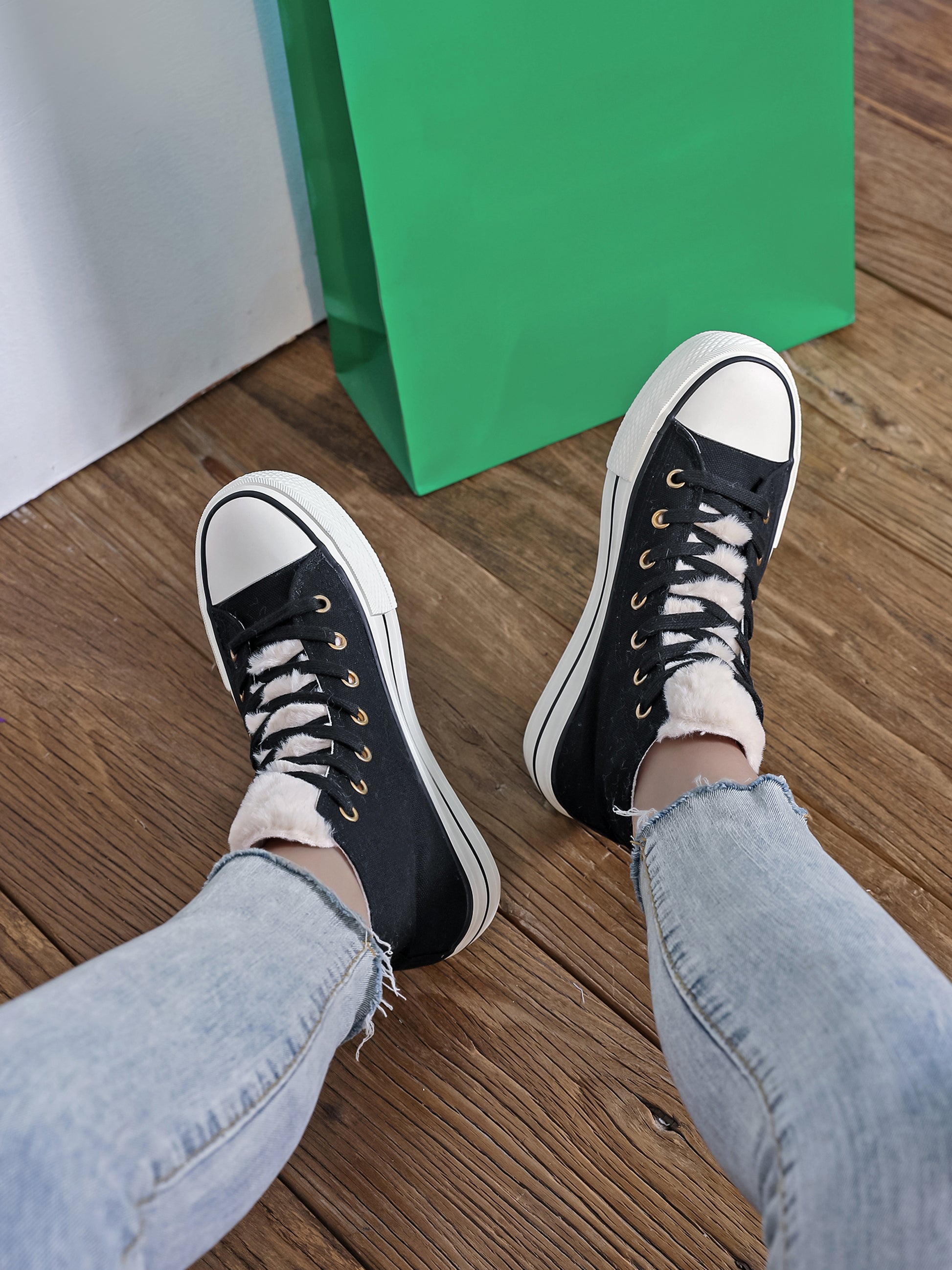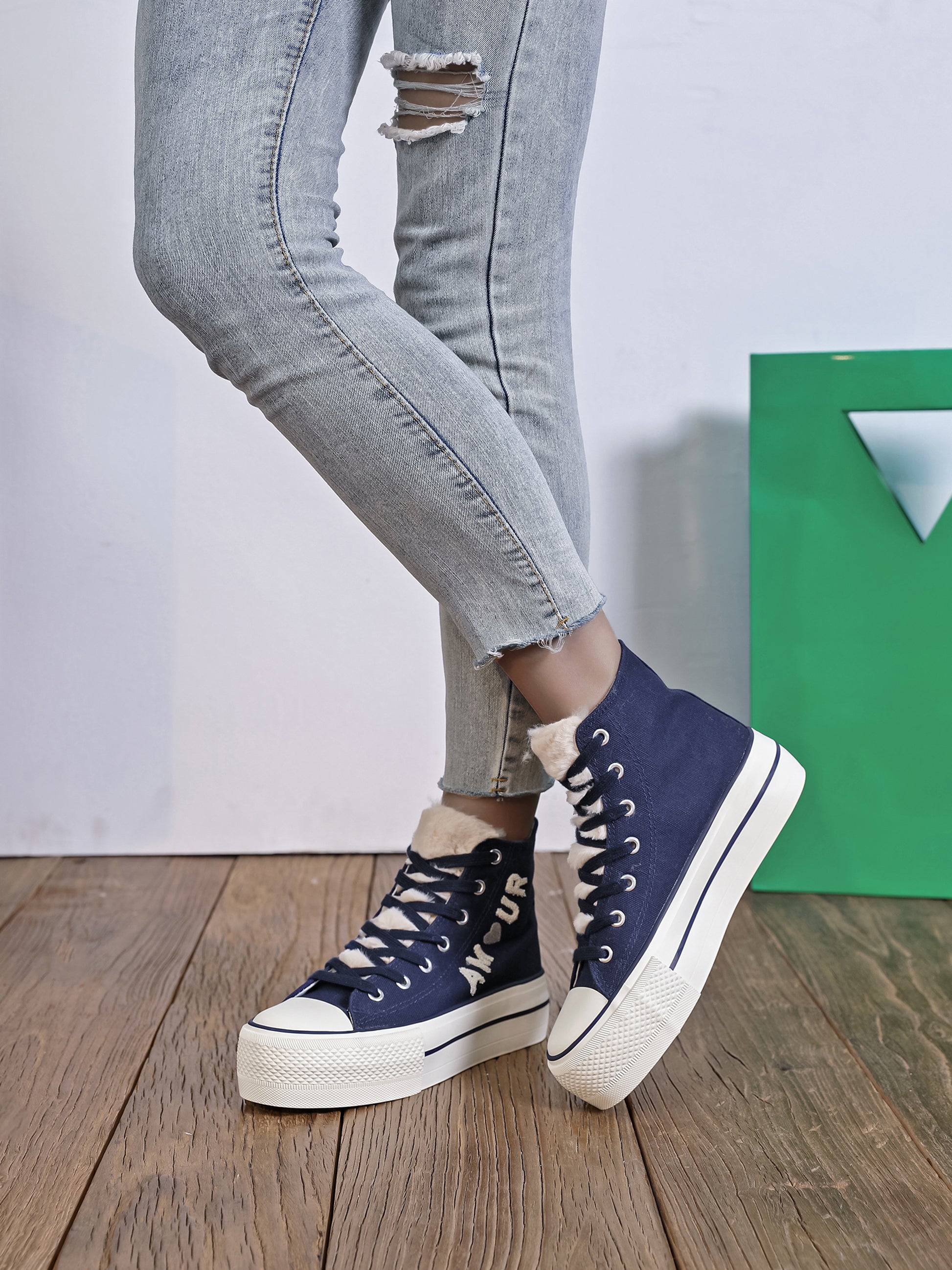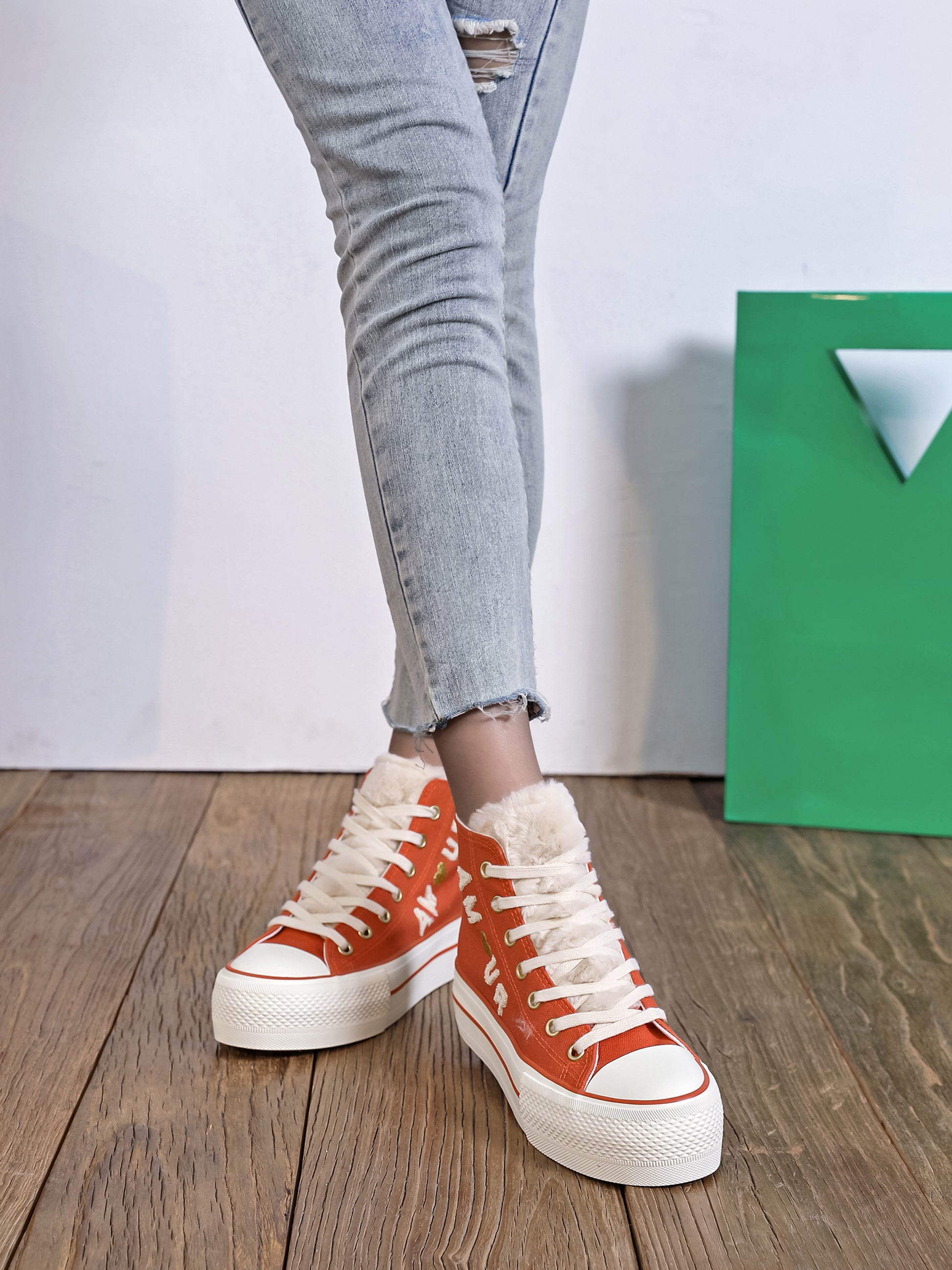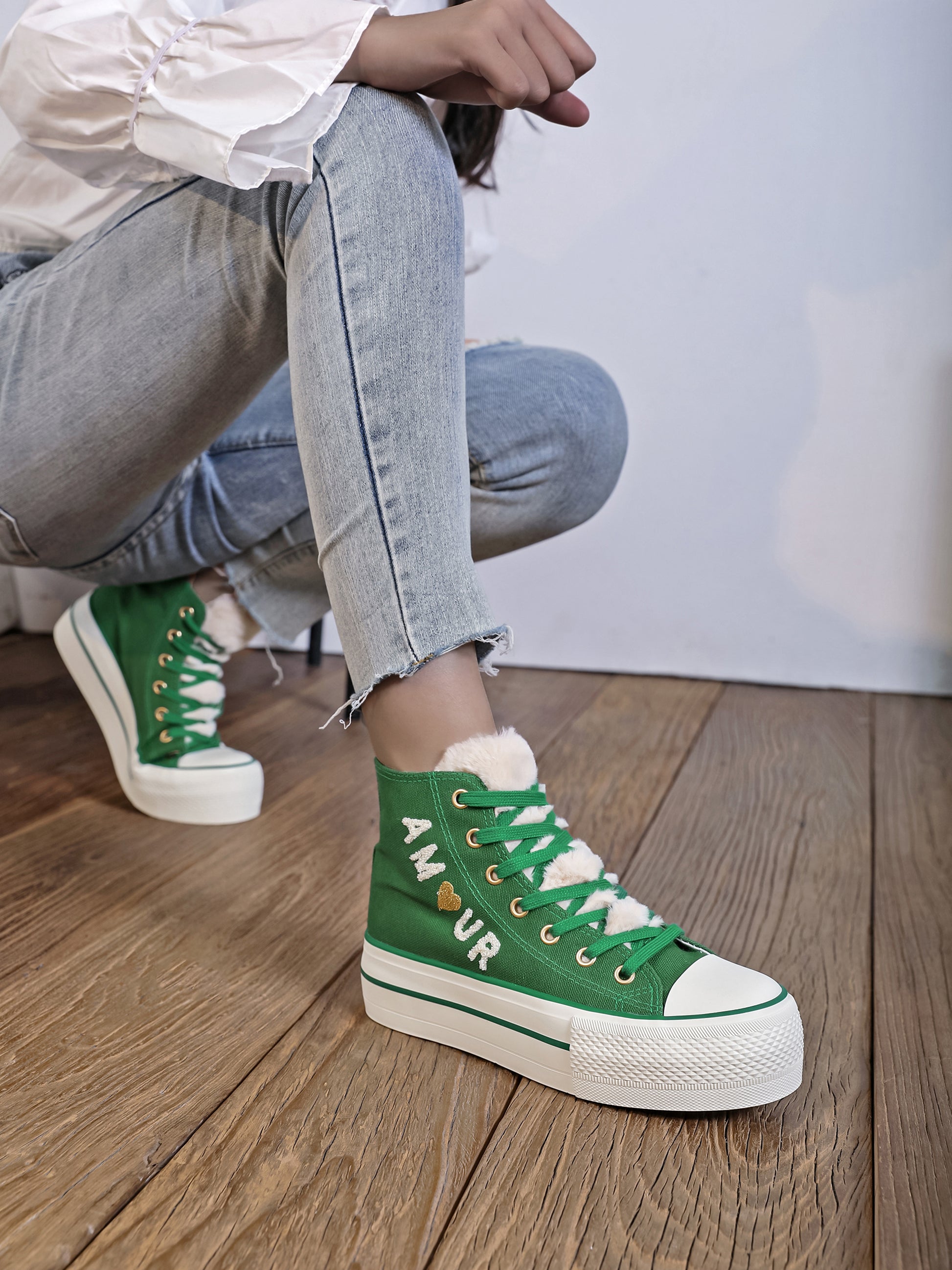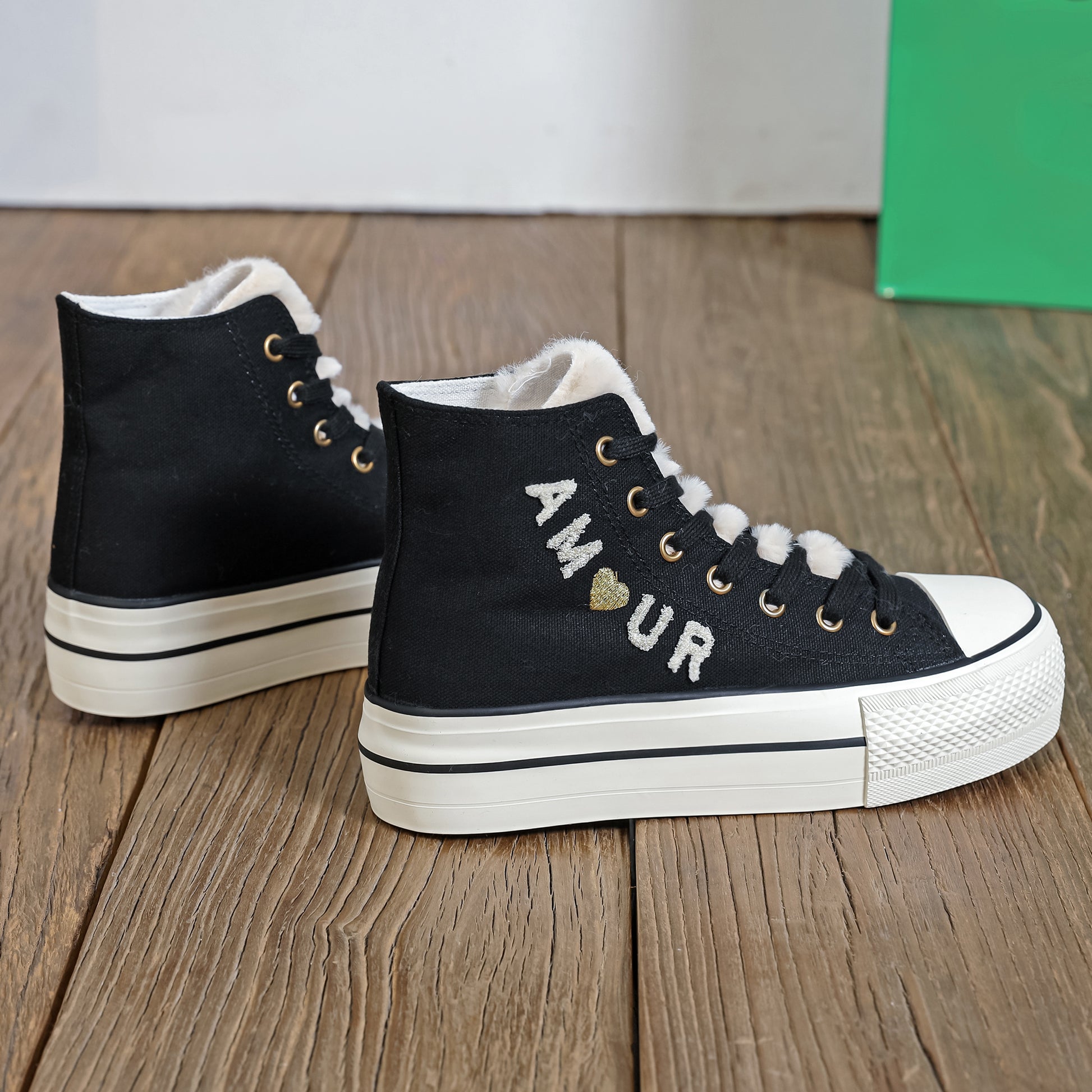 La grande tendance : La basket en toile avec broderie Amour, présentée ici en version fourrée sur la languette de devant.