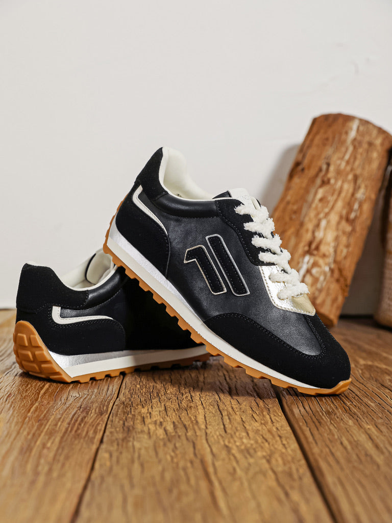 Baskets au design rétro chic en suède noir, sublimées par des touches ivoire et un logo latéral ton sur ton. Leur semelle en gomme caramel à reliefs antidérapants assure confort et adhérence. Élégantes et polyvalentes, elles revisitent l’esprit running avec une allure urbaine raffinée, parfaites pour un style moderne et décontracté.