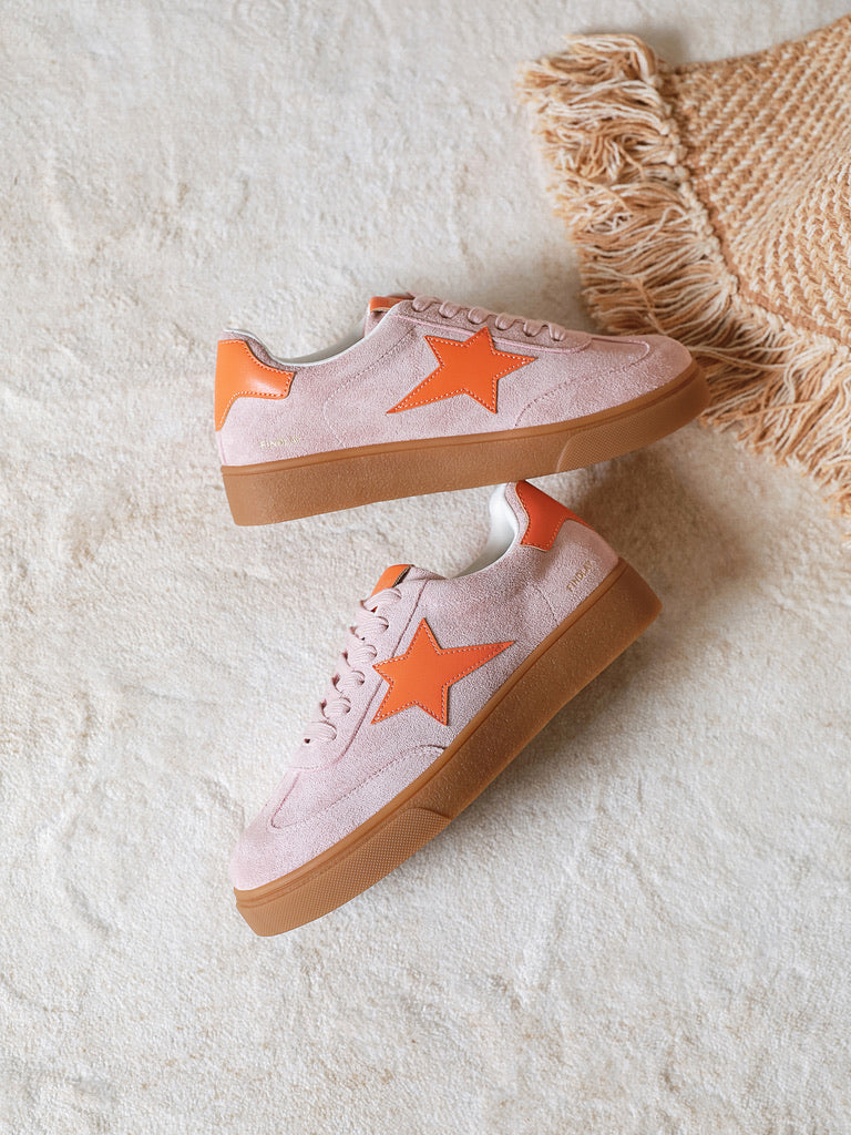 Elles se distinguent par une grande étoile orange contrastante sur le côté et un empiècement orange au talon qui apporte une touche pop et solaire. Lacets ton sur ton, semelle gomme camel pour un esprit vintage assumé.