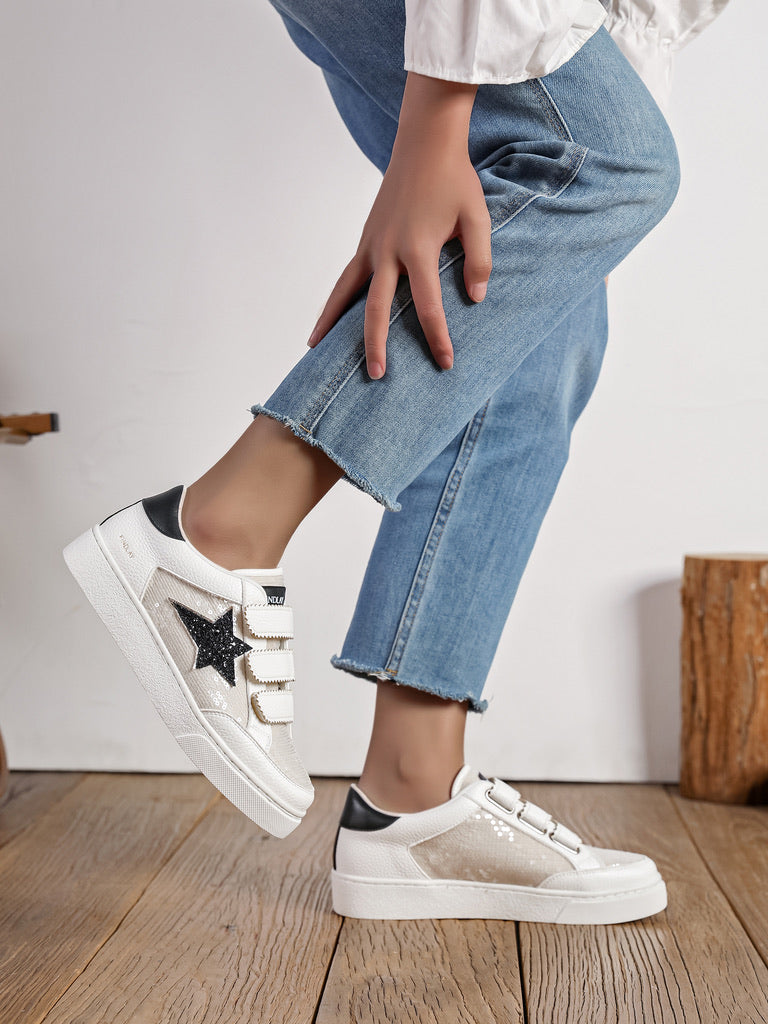 Cette chaussure est une basket tendance qui allie confort et style avec une touche scintillante.