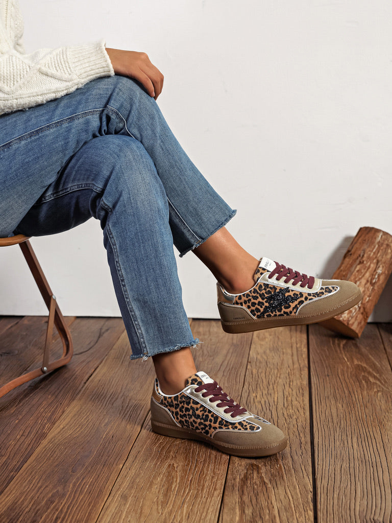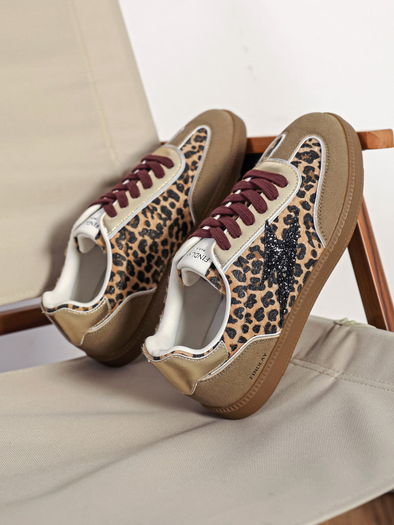 Baskets basses au motif léopard beige et marron, rehaussées d’une éclair noire pailletée sur le côté. Les lacets bordeaux apportent une note audacieuse et contrastante, tandis que la semelle en gomme brun clair assure confort et allure décontractée. Un modèle original qui conjugue esprit sauvage et élégance urbaine.