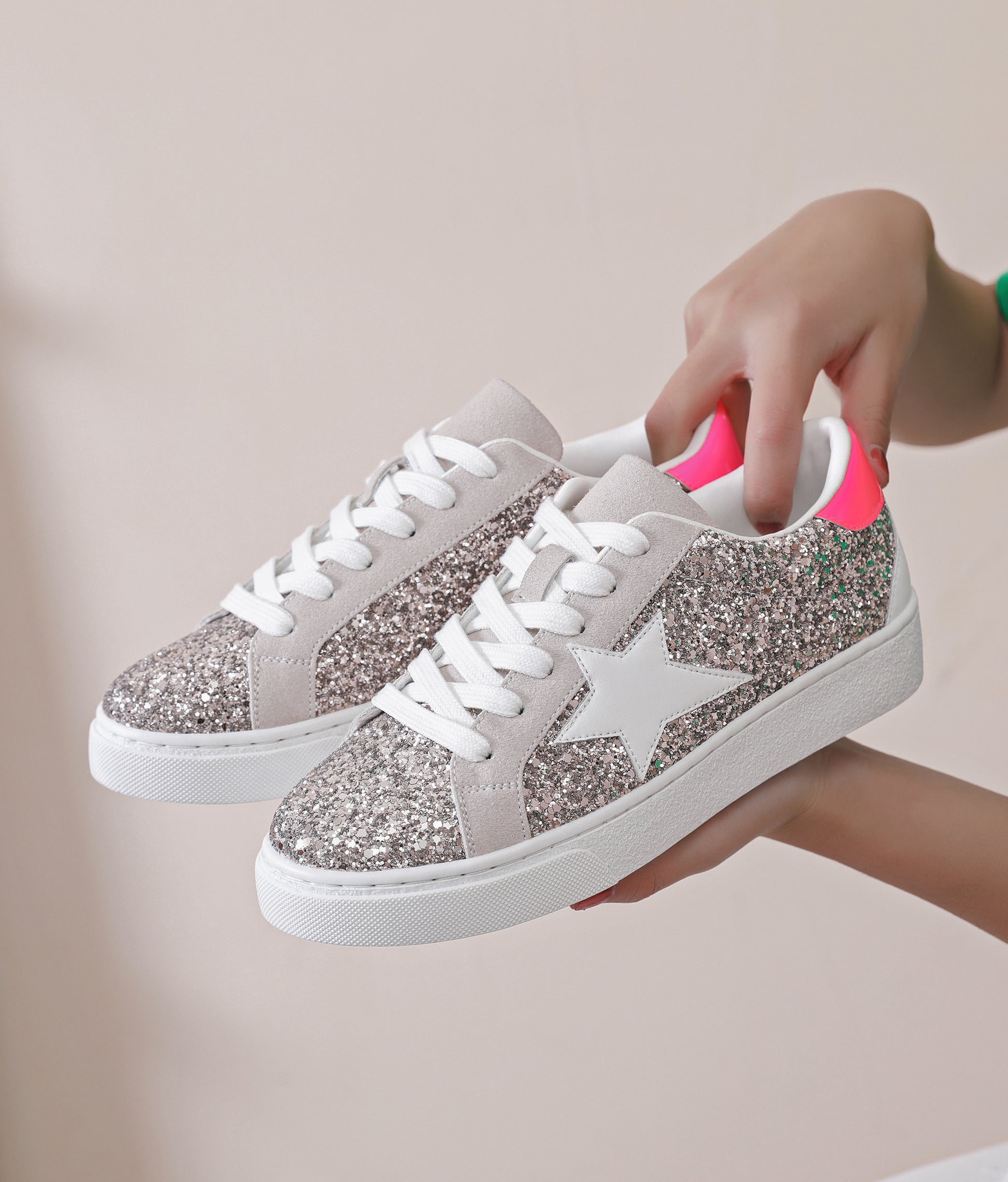 Magnifique modèle de basket pailletés avec une découpe en forme d'étoile ainsi qu'un contrefort rose fluo. Elles apporteront une touche de couleur à vos tenues!