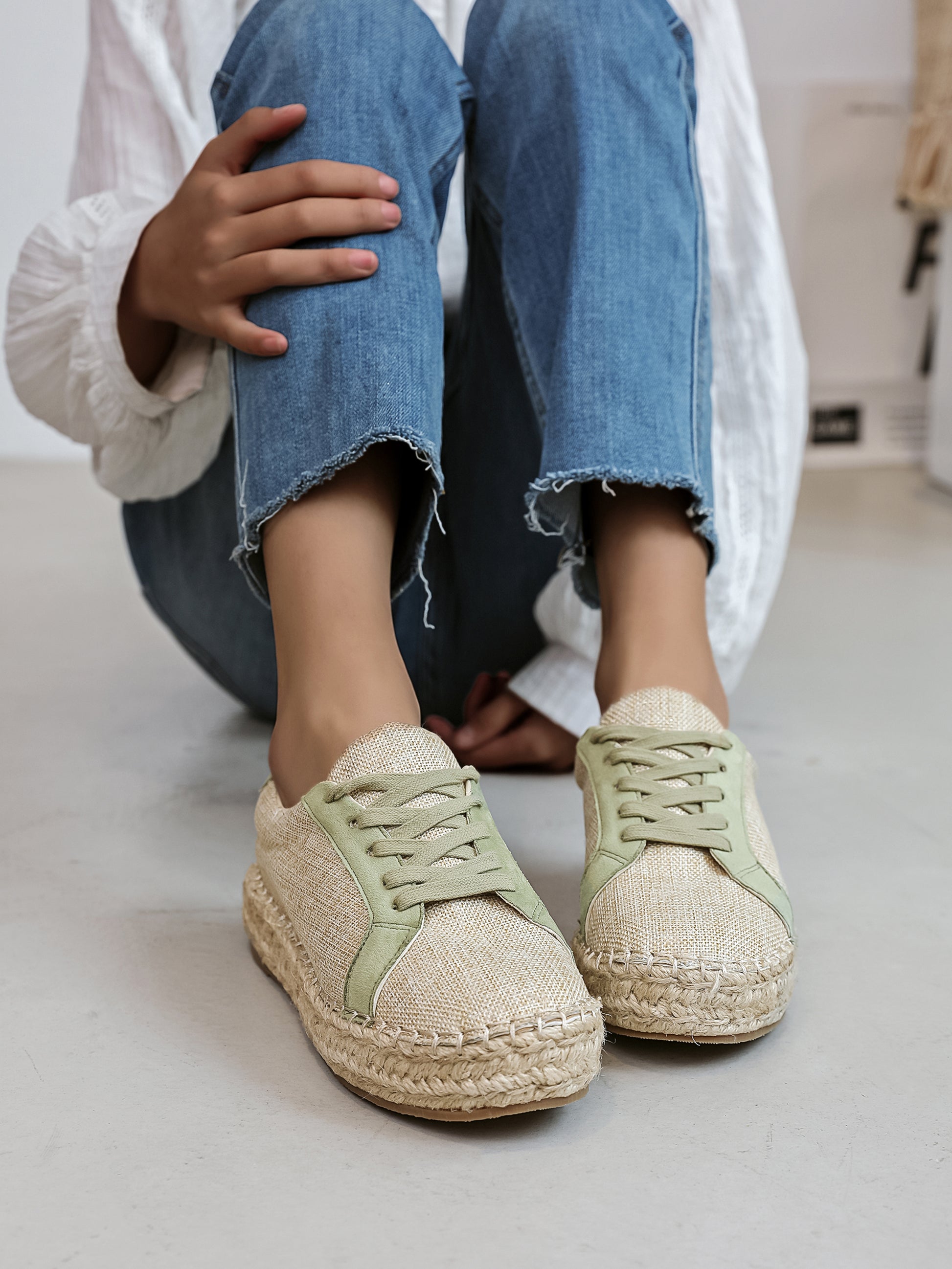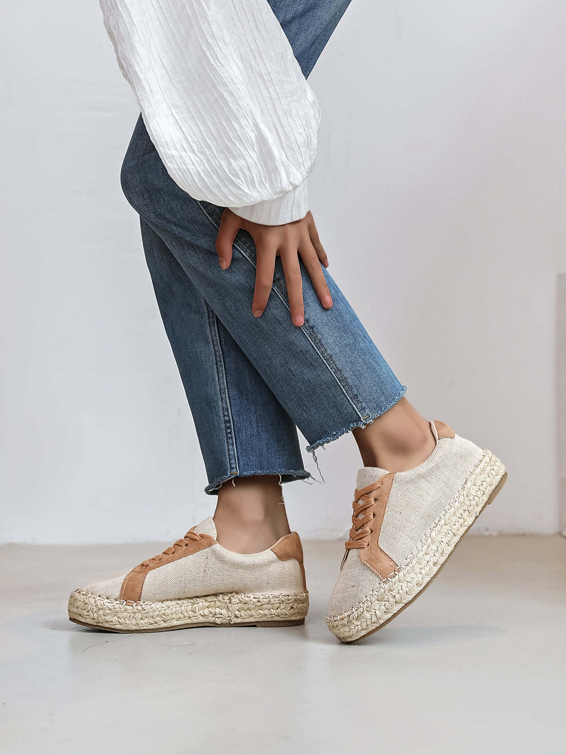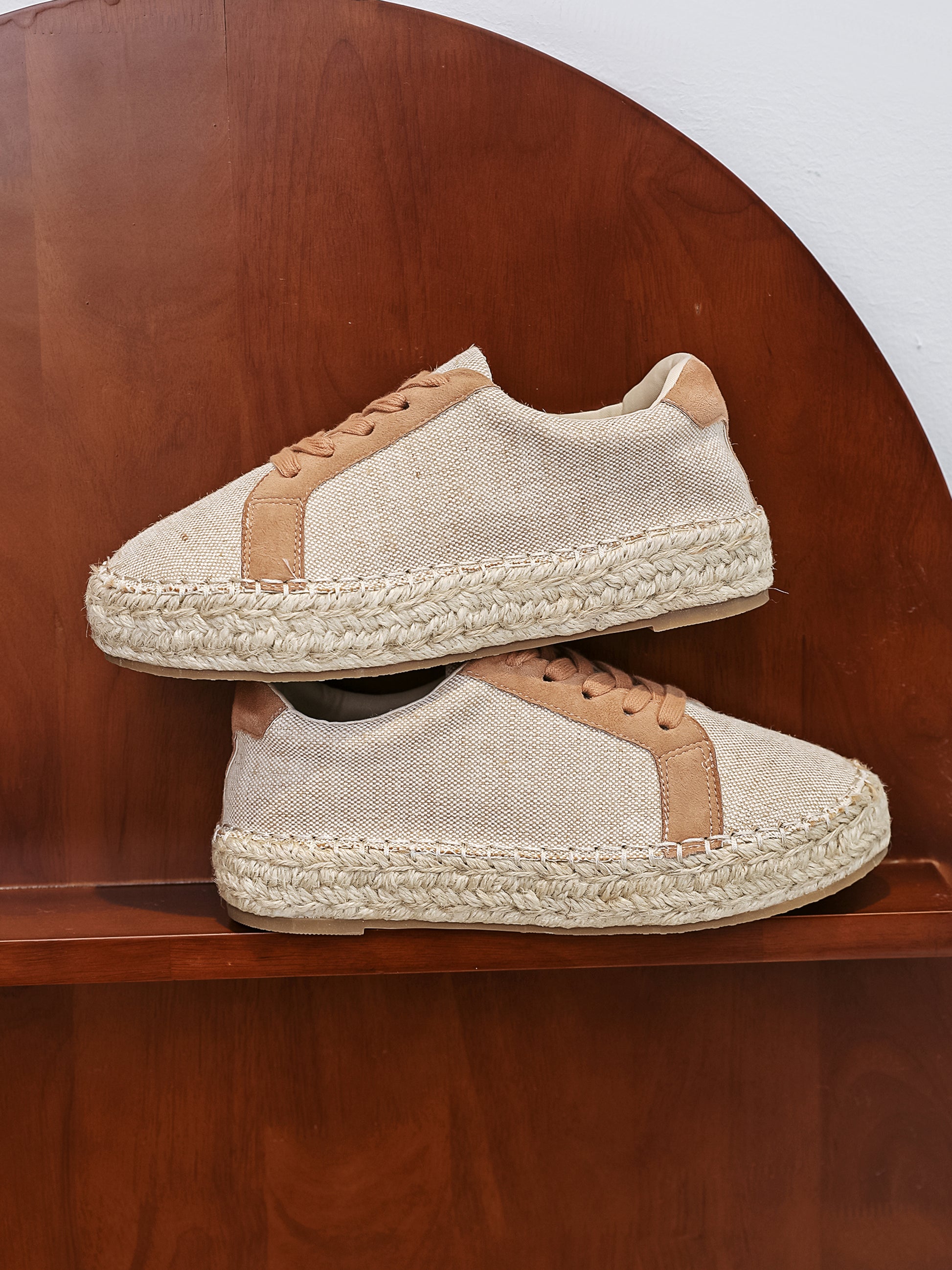 Baskets en tweed beige sur une semelle en corde style espadrille.