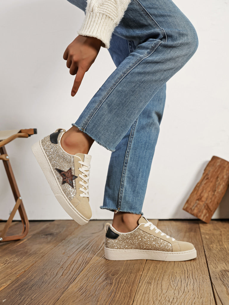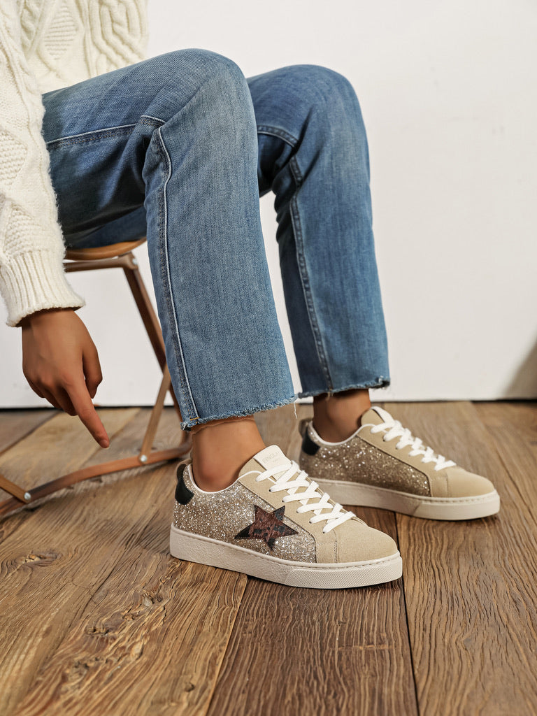 Baskets basses en cuir suédé beige ornées de panneaux pailletés dorés et d’une étoile contrastante marron sur le côté.