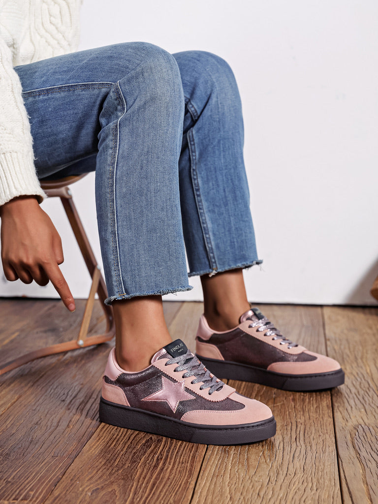 Baskets basses en suédine rose poudré et textile métallisé, ornées d’une étoile rose sur le côté. Les lacets gris et la semelle noire contrastante apportent une touche contemporaine et affirmée. Un modèle féminin et moderne qui associe éclat et confort pour sublimer un look citadin.