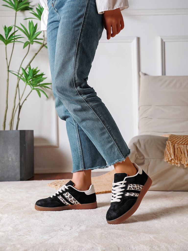 Basket femme au style casual chic, en matière effet suédine noire avec détails contrastés. Les bandes latérales à imprimé léopard apportent une touche tendance, tandis que les lacets blancs créent un contraste élégant. La semelle couleur gomme offre confort et adhérence au quotidien. Un modèle facile à porter, idéal pour compléter des tenues décontractées avec caractère.