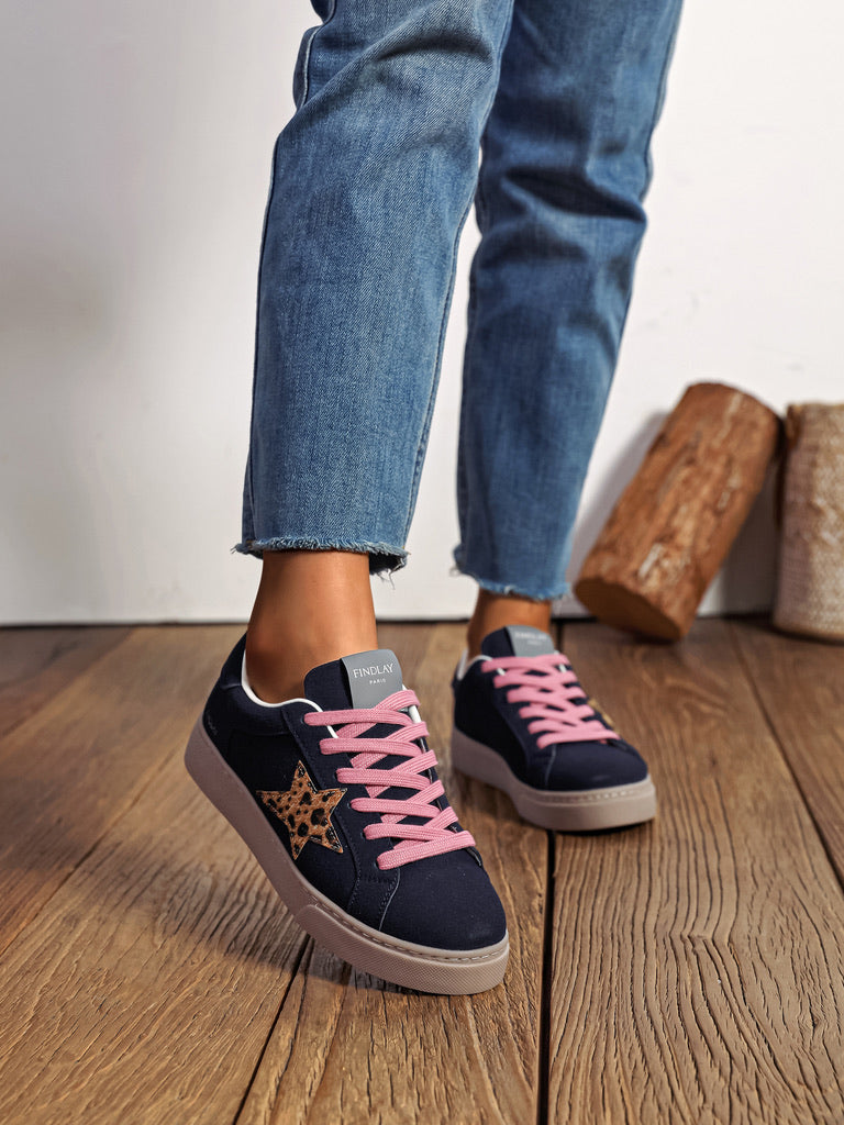 Baskets basses en toile bleu marine, décorées d’une étoile imprimé léopard sur le côté. Les lacets rose poudré apportent une touche audacieuse et féminine, tandis que la semelle épaisse beige contraste avec élégance. Un modèle contemporain qui allie confort et originalité, parfait pour dynamiser une tenue décontractée.