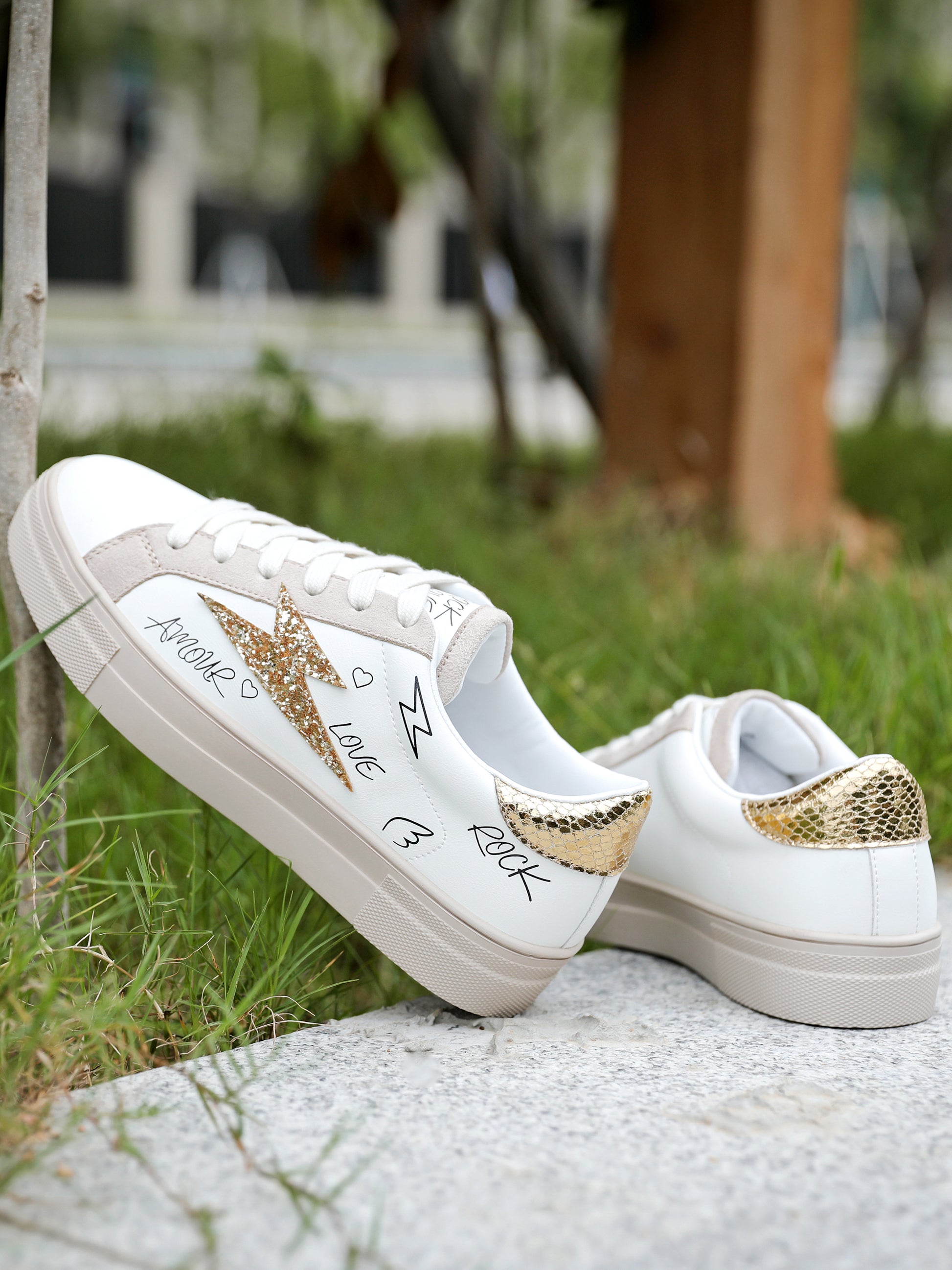 Basket blanche avec des écritures sur l’empeigne ainsi qu’une découpe en forme d’éclair dorée. Contrefort de la chaussure dorée écaillées.