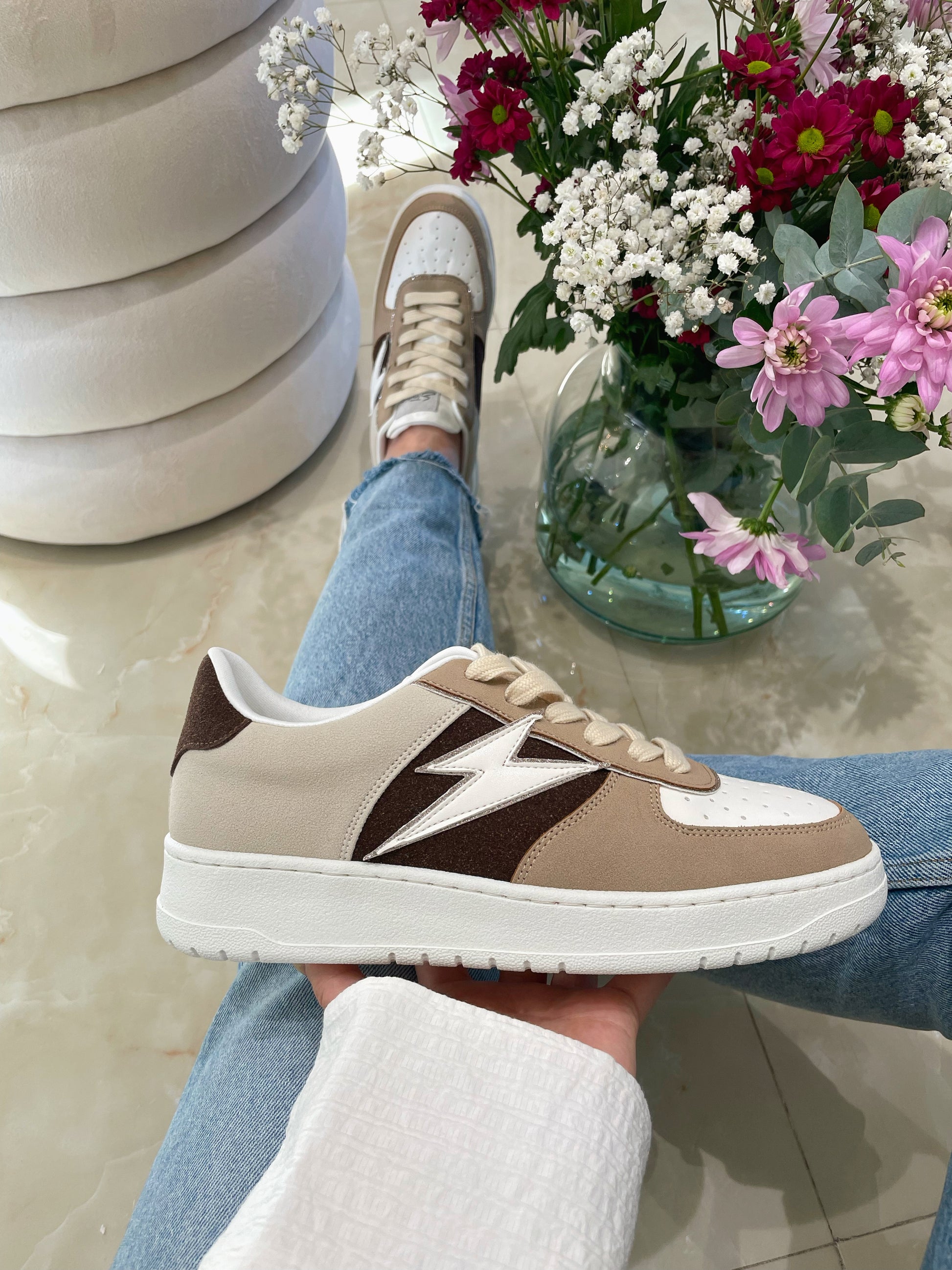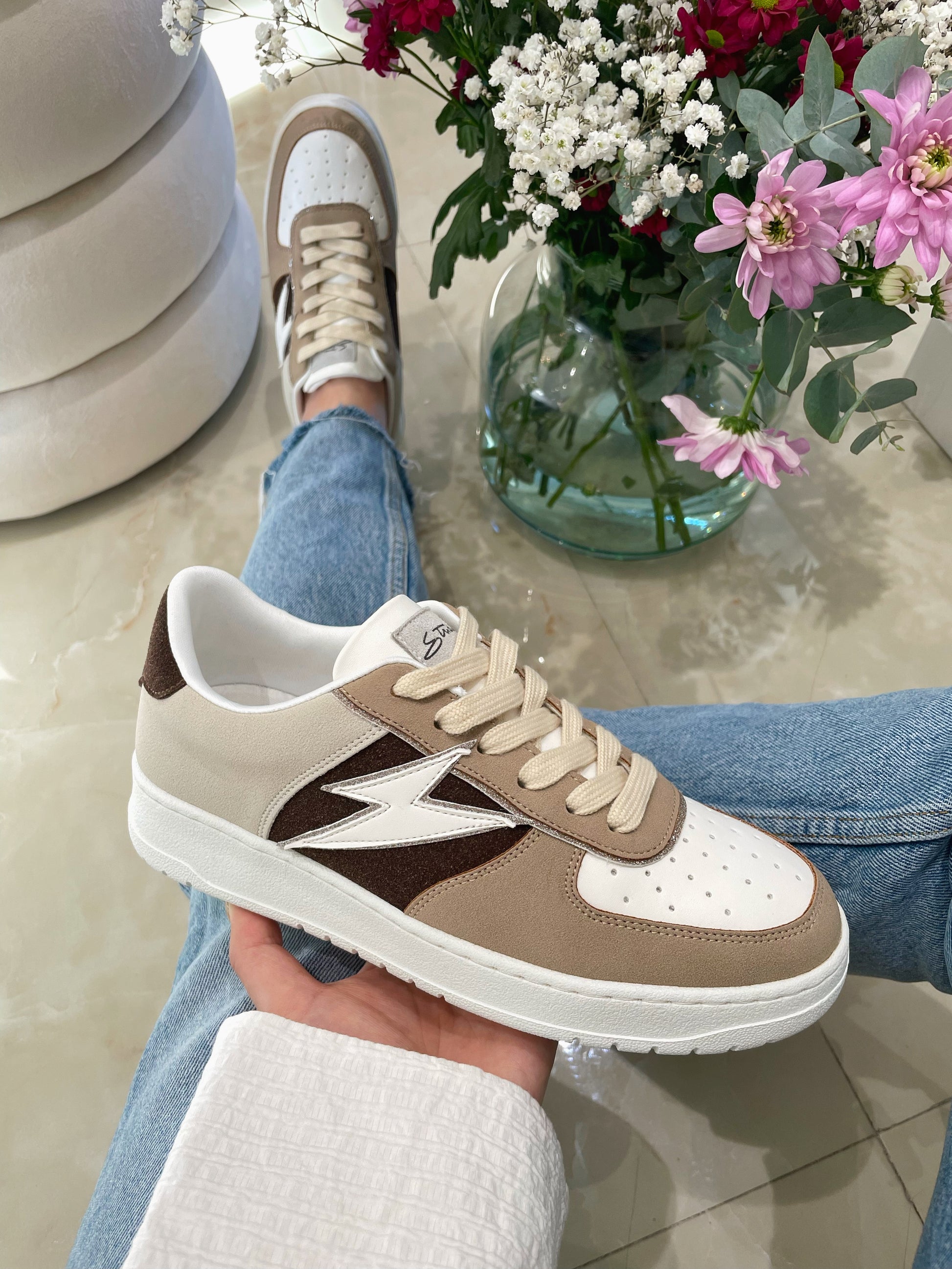 Baskets en simili cuir à bout rond décorées d’une éclair blanche et d’empiècements beige marron.