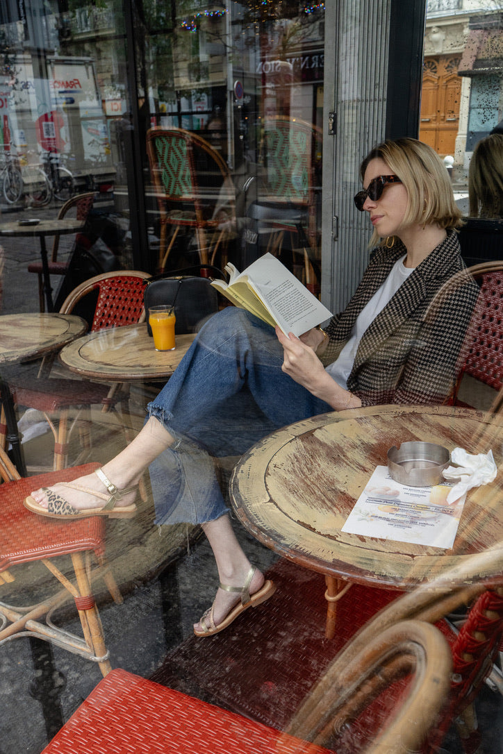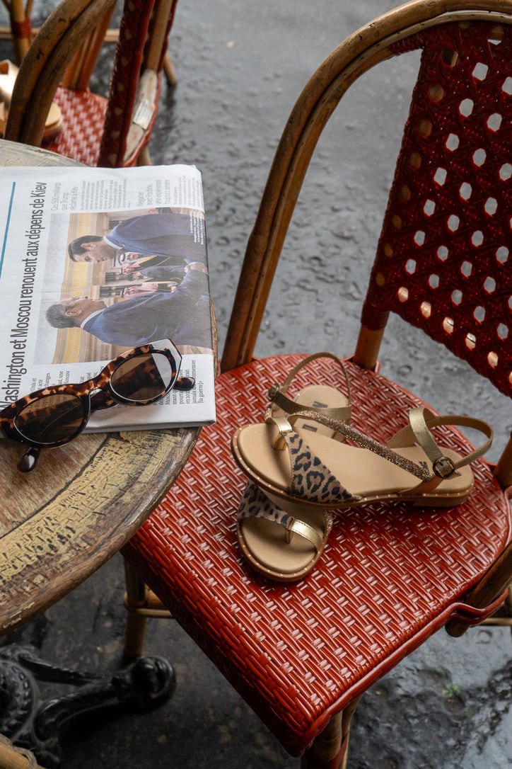- Lanières en cuir métallisé doré et en tissu scintillant.