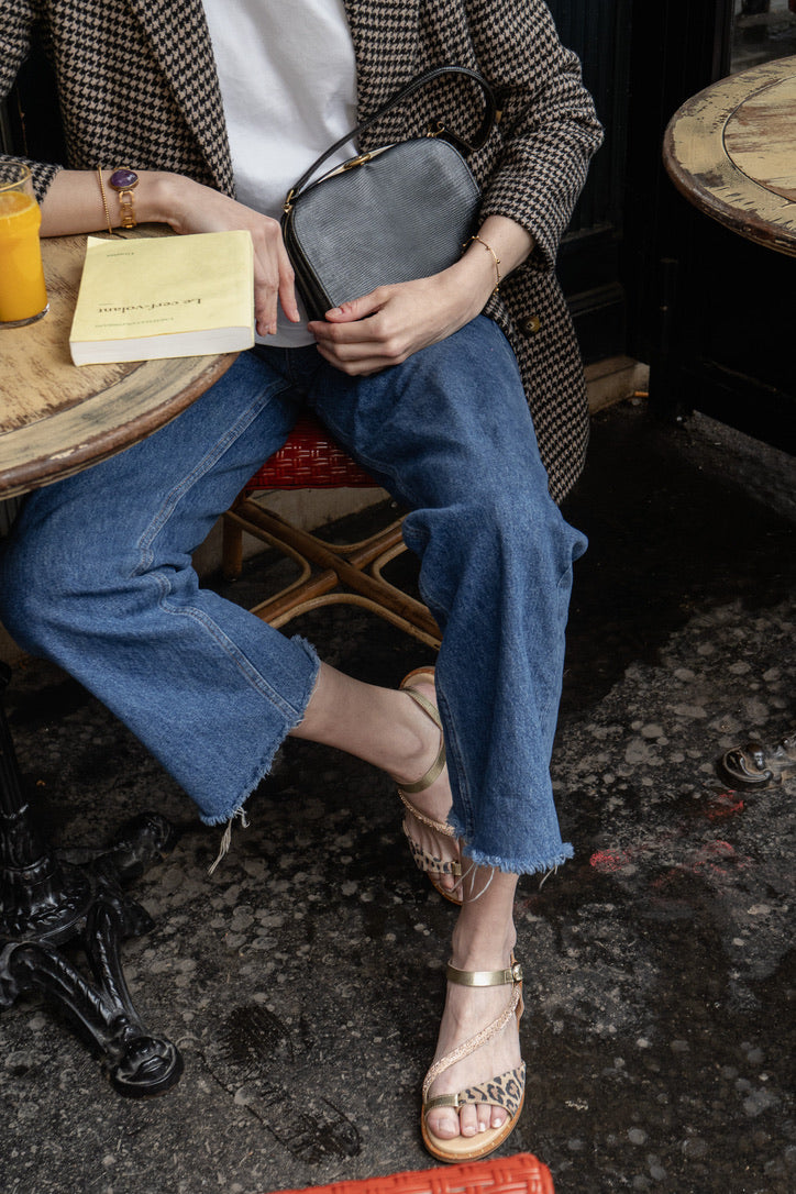Cette sandale plate combine élégance et originalité avec un mélange de textures et de motifs audacieux.