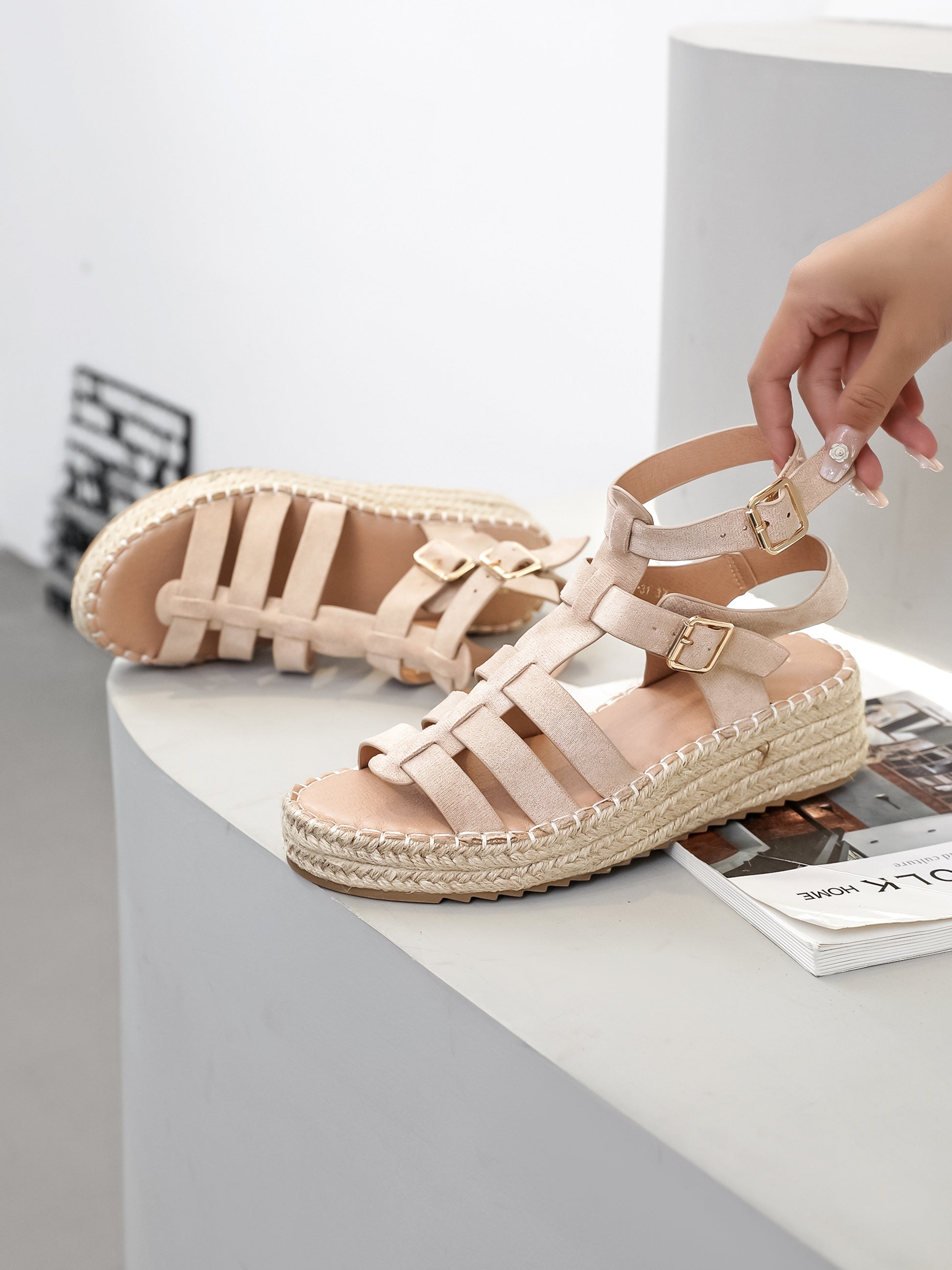 Une nouvelle interprétation des sandales de pêcheur. Un modèle à bout ouvert doté de plusieurs brides en suédine souple reposant sur une semelle à plateforme enveloppée de toile de jute.